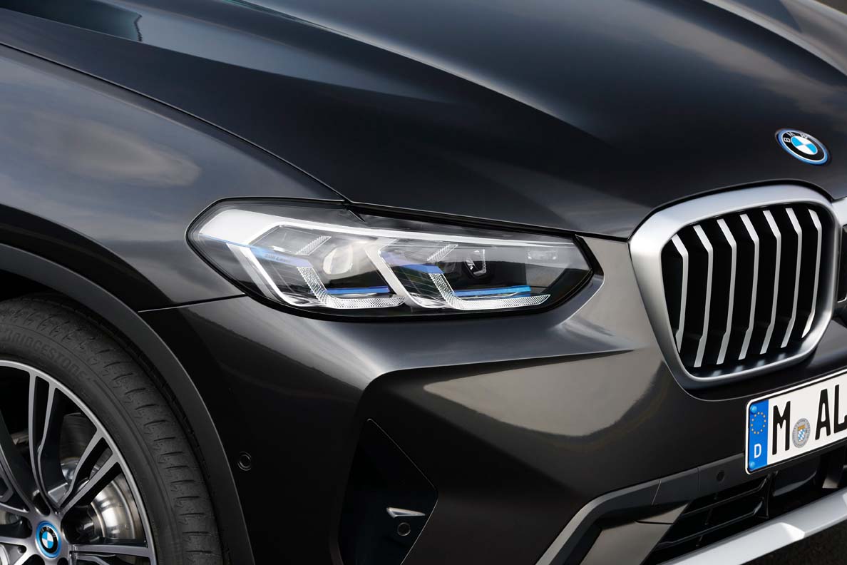 With the redesigned BMW kidney grille, headlights that are around ten millimetres flatter and the new front apron, the BMW X3 looks almost like a new vehicle. More strikingly shaped, especially in the upper area, the BMW kidney grille is larger than before and now comprises a single-piece frame. A black bar in which the iCam is positioned if fitted ensures visual separation of the grille. The front headlights feature full LED technology as standard. In addition to the optional adaptive LED headlights with Matrix function, where the adverse weather light takes on the function of the previously separate fog lights, the BMW Laser Light with a range of up to 650 metres is now also available as an optional extra.