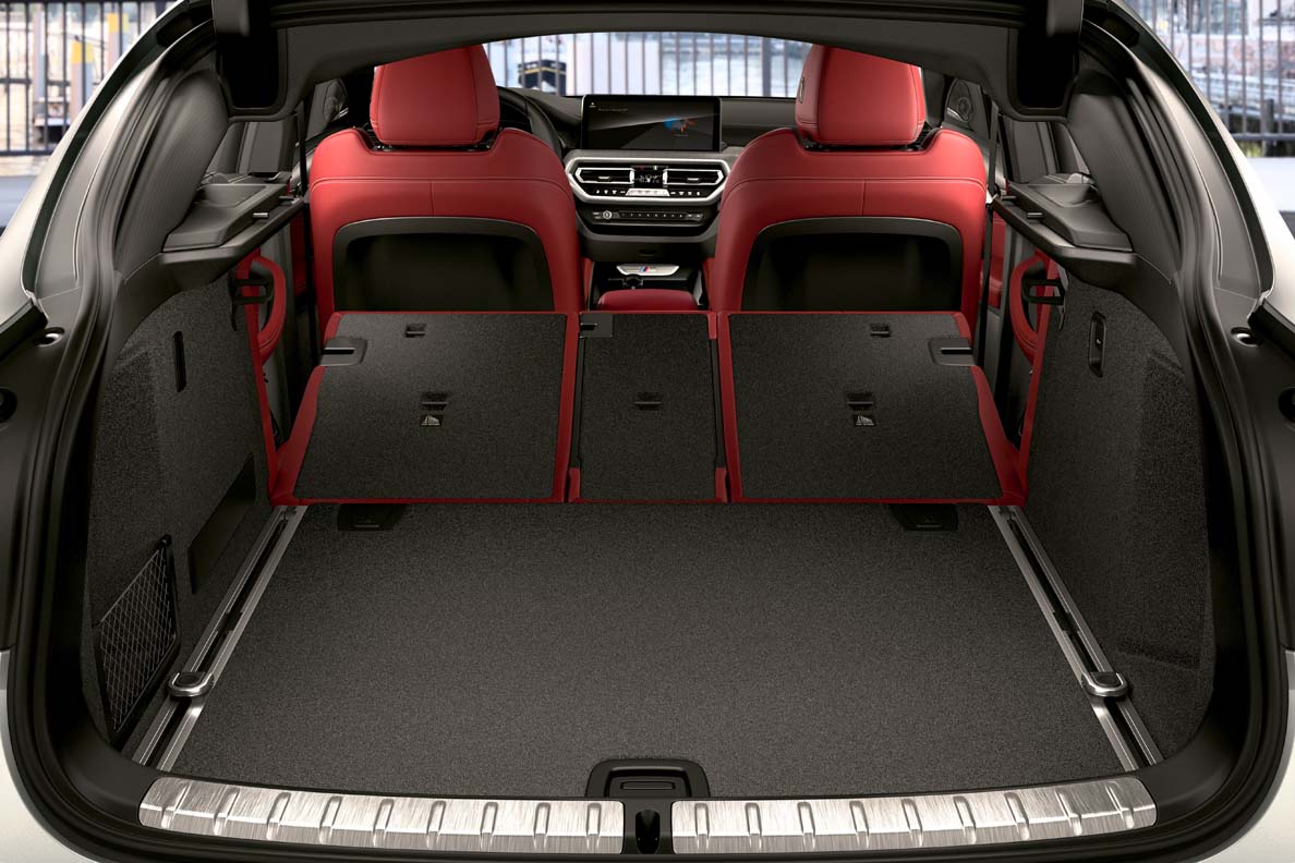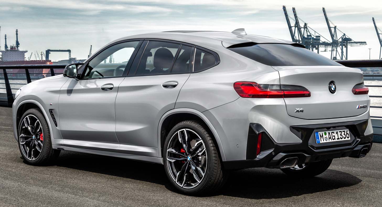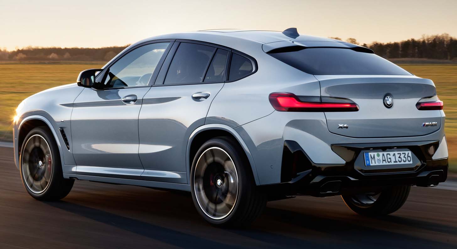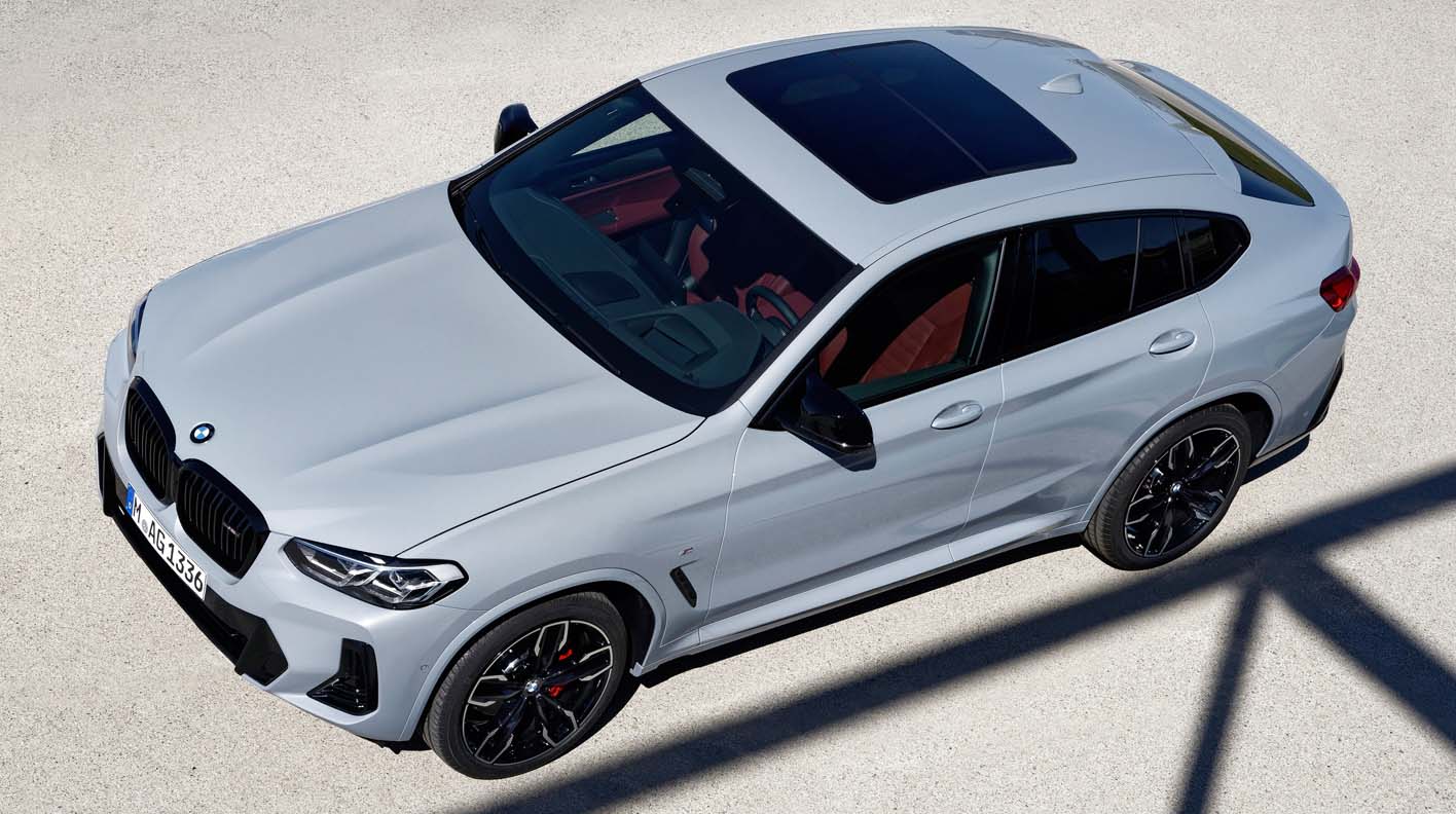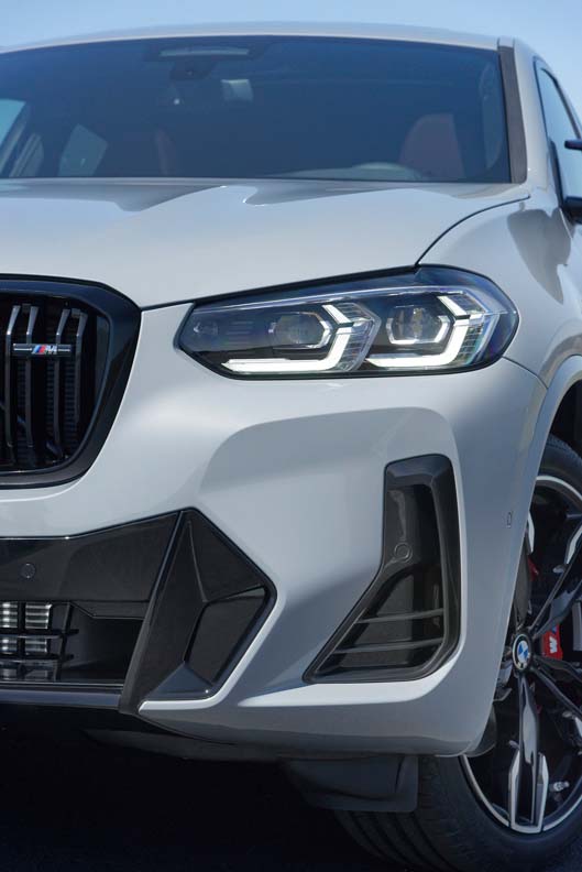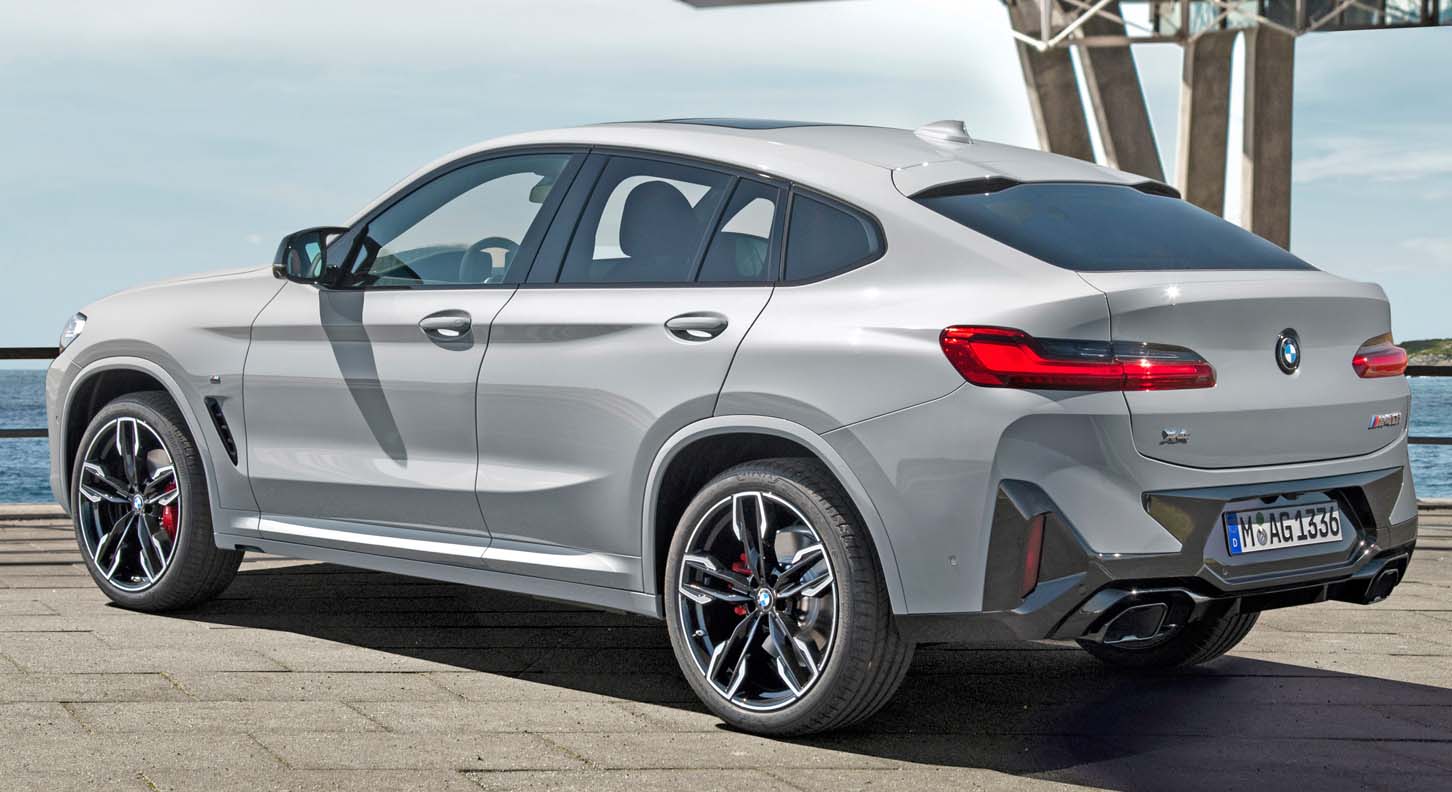 The BMW X4 adopts the new front end of the BMW X3, but adds an exclusive distinguishing feature in the form of the mesh kidney familiar from other sporty BMW models. Compared to the BMW X3, the adaptive LED headlights with Matrix function are already standard, while the BMW Laser Light, which is particularly light-intensive and has a long range, is also available as an option for the BMW X4. Featuring flat full LED rear lights that emphasise the vehicle width and protrude strikingly from the vehicle body in their three-dimensional design, the rear section now has an even more clear-cut shape in the BMW X4 revision. The new rear apron has a tidier appearance, with an increased proportion of painted surface and reflectors now placed vertically and lower in the bumper. The wide free-form tailpipe trims echo the horizontal lines of the upper section.