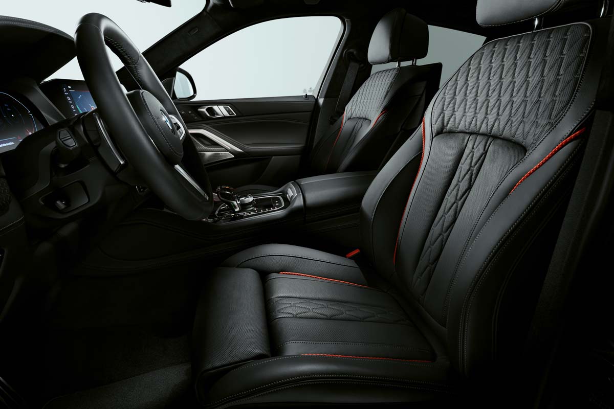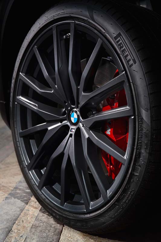 The M headlights Shadow Line with BMW laser light, including accented lighting with blue X signature, complete the distinctive look of the front end. Moreover, on the exterior, the M Sport Package emphasises the dynamic character of the BMW X5 and X6 Black Vermilion editions. It comprises, among other things, specific front and rear aprons as well as the M high-gloss Shadow Line with extended options. Behind the Orbit Grey matt, 22-inch, double-spoke 742 M light alloy wheels with mixed tyres designed exclusively for these edition models, red high-gloss M Sport brake callipers stand out as a striking visual highlight.
