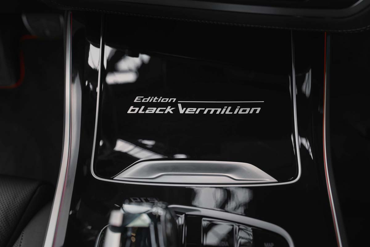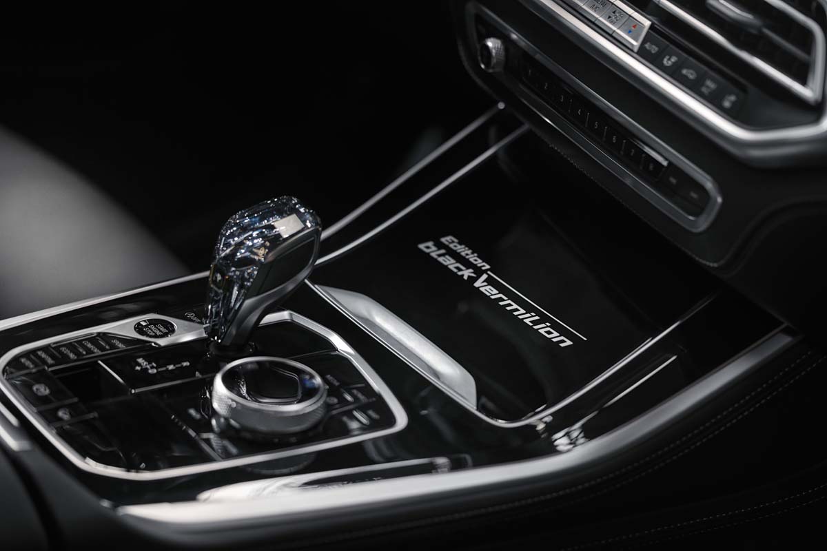 In the interior of the BMW X5 and BMW X6 Black Vermilion editions the M Alcantara Anthracite roof liner provides for an exceptionally sophisticated ambience. A finely crafted Edition logo on the cupholder cover in BMW Individual black piano finish emphasises the limited model’s exclusiveness. The glass application Crafted Clarity on the iDrive Controller, the automatic gear selector and Start/Stop button, as well as the BMW Individual precious wood interior trim Fineline Black with aluminium inlays provide additional sophisticated accents.