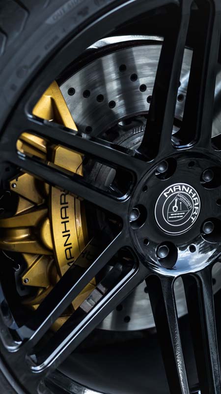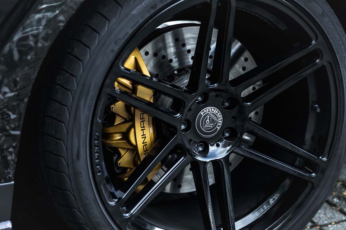 The brake system remained standard on the vehicle pictured – with the exception of an individual MANHART design for the multi-piston calipers; individually configurable upgrades can be made here on request.