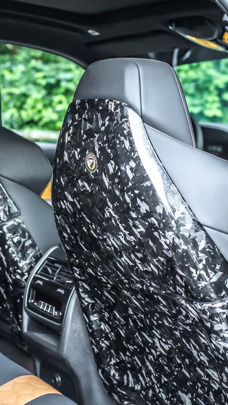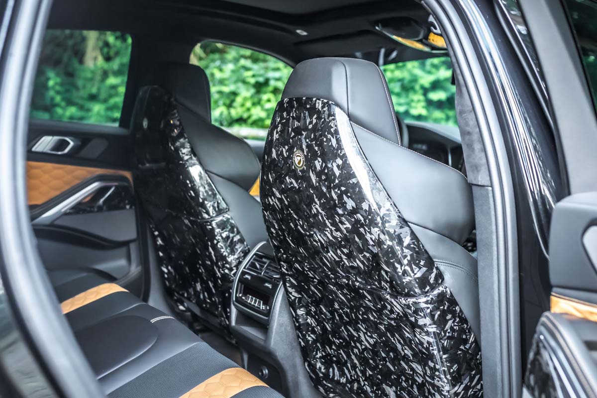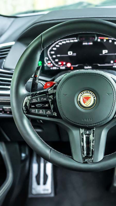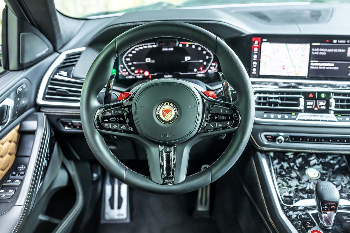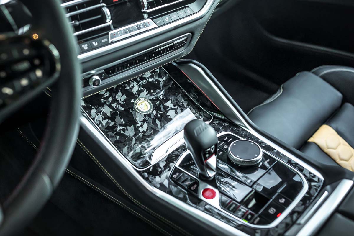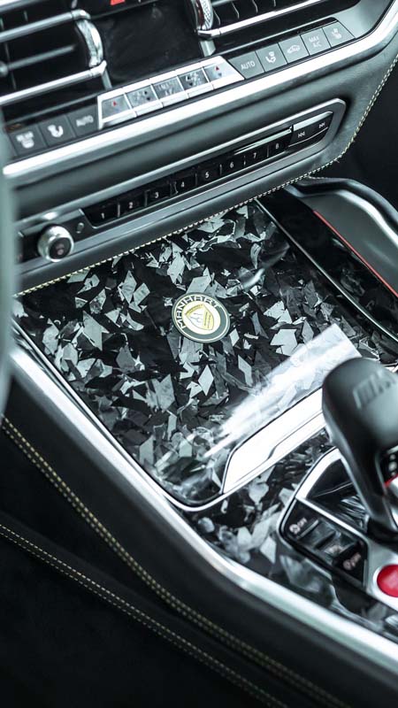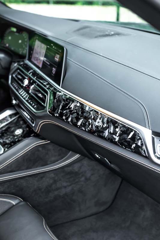 In keeping with the exterior styling, Manhart also continued the extravagantly exclusive Forged Carbon refinement in the passenger compartment: here a twelve-piece Forged Carbon interior kit sets shimmering accents. The irregular, short-fibre high-tech fabric adorns the dashboard, centre console and door panels as well as the spokes and gearshift paddles of the M sports steering wheel. Forged Carbon is also used on a large scale on the two-piece backrest shells and the console trim of the sports seats.