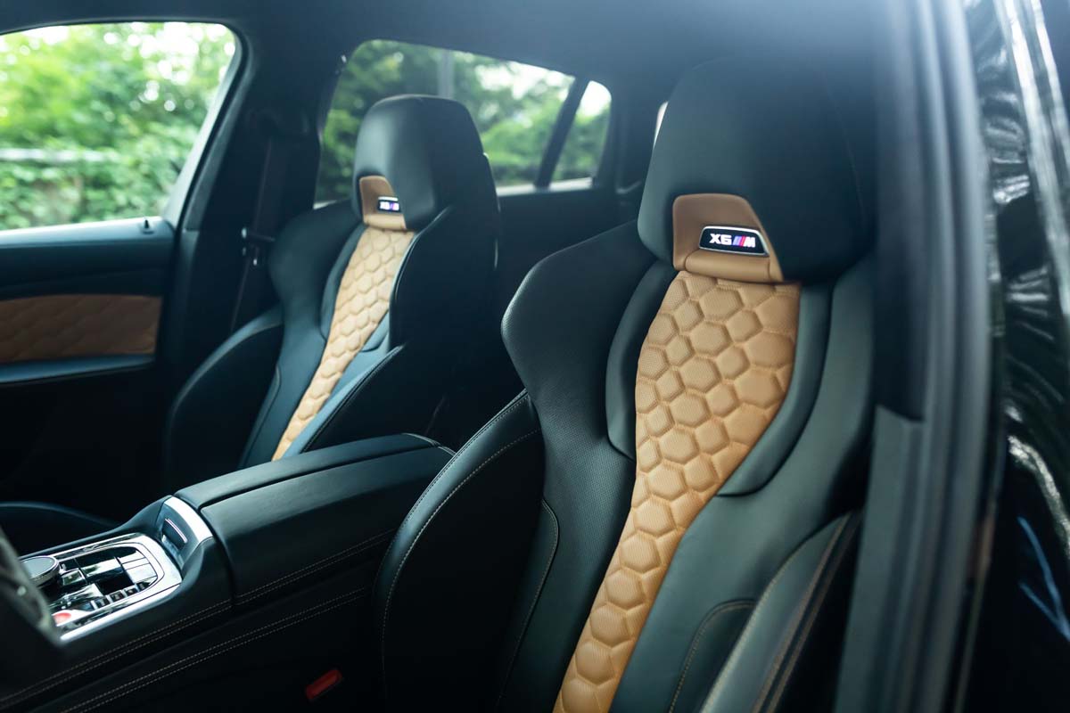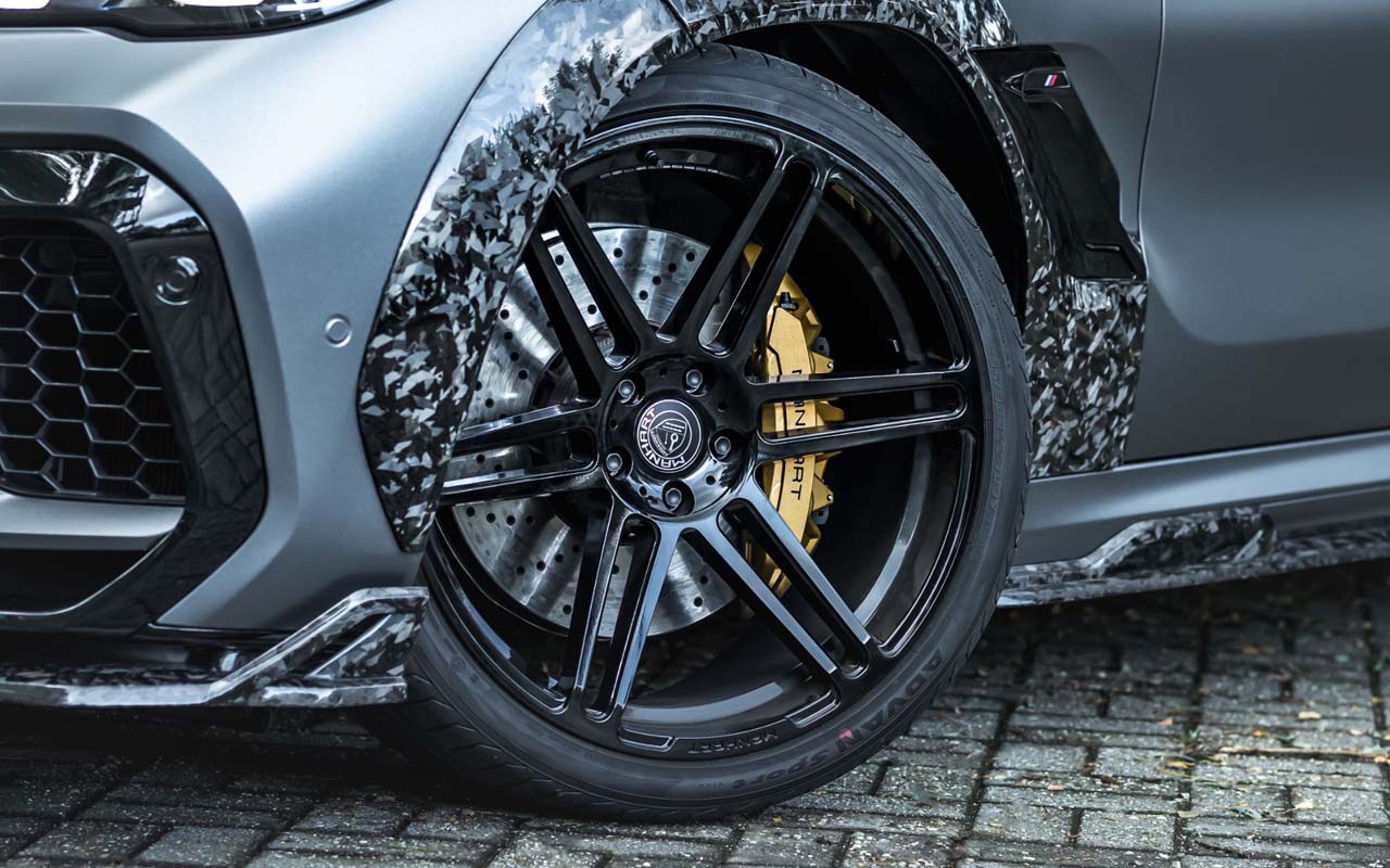 To match, MANHART Concave One, double-spoke forged wheels in satin black rotate in the voluminous widebody wheel arches. Installed in XXL dimensions of 10.5×22 at the front and even 11.5×22 inches at the rear, the MANHART rims wear high-performance tyres in dimensions 295/30R22 and 315/30R22. Our engineers have reduced the X6 M’s high ground clearance by around 30 millimetres by means of an in-house suspension optimisation, the central components of which are lowering springs by H&R. The X6 M’s muscular appearance is of course also enhanced by the MANHART suspension.