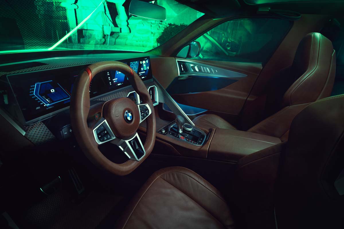 Inside the BMW Concept XM, the driver will find a distinctive M interpretation of driver-focused cockpit design. The lines and surface design of the instrument panel, centre console, door trim and seats give the ambience in the front compartment a progressive feel with their powerful geometry and high-quality materials. Brown, vintage-look leather, copper and carbon fibre create a bridge between luxury and motor sport. A bold trim element provides clear visual separation between the driver’s area and the other sections of the car.