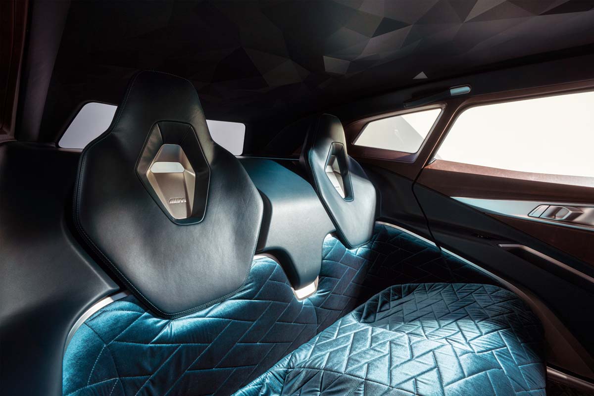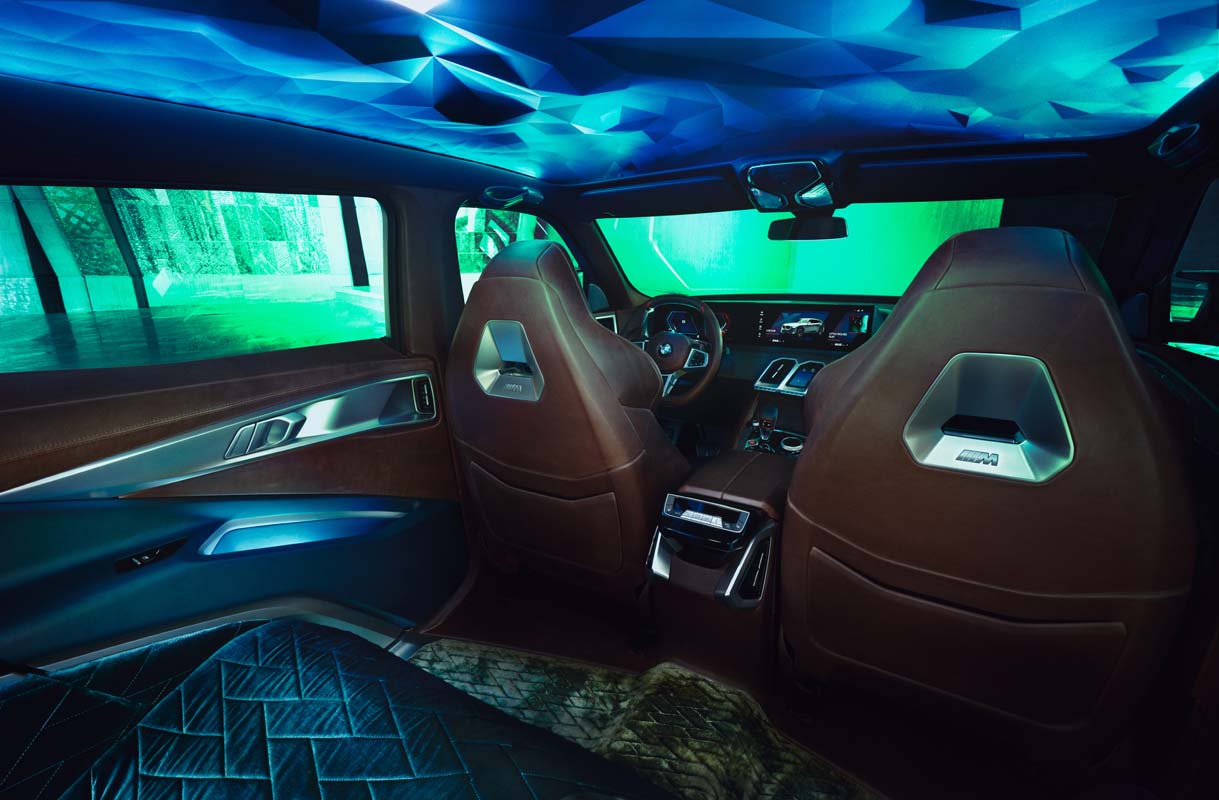 The unwavering driver focus of the front compartment contrasts with the extravagant and luxurious lounge-like ambience in the rear of the BMW Concept XM. Special materials, visually powerful surfaces and expressive details turn the rear seats into the unique M Lounge, black-tinted rear side windows underscoring the abiding sense of privacy here. While warm brown leather dominates the cockpit, the rear is decked out in the rich colour shade Petrol. The large rear seat bench with its deep seat recesses forms an inviting space to relax. Only the diamond-shaped area of the head restraints – which provides the supporting function familiar from BMW M Sport seats in other models – is leather-trimmed. The lower sections of the seats offer high comfort and an exclusive couch character with their luxurious velvet upholstery and diamond quilting. Deep-pile carpeting with a diamond pattern adds to the exclusive impression.
