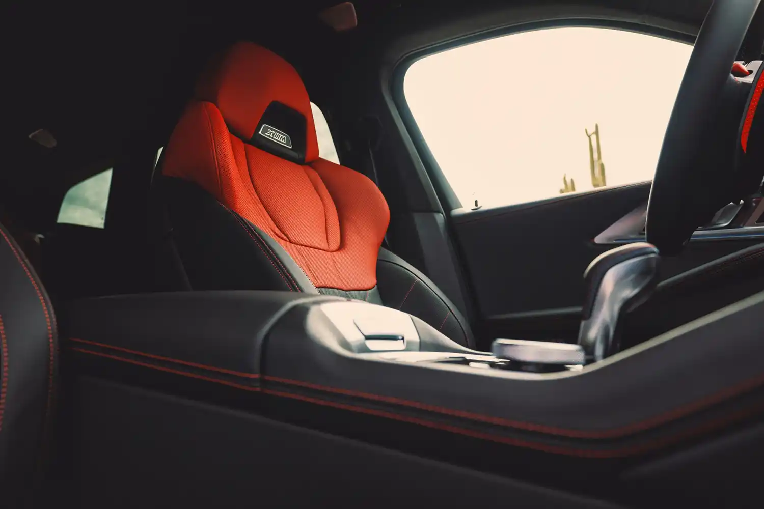 The M xDrive all-wheel-drive system channels the power generated by the combustion engine and electric motor between all four wheels precisely, quickly and as required at all times. The system has a rear-biased setup, which enhances the agility of the BMW XM Label Red and is particularly pronounced in 4WD Sport mode. When the DSC (Dynamic Stability Control) system has been fully disengaged, the traction-optimised 4WD Sand mode – conceived specifically for driving over dunes and similar surfaces – can be activated via the M Setup menu.