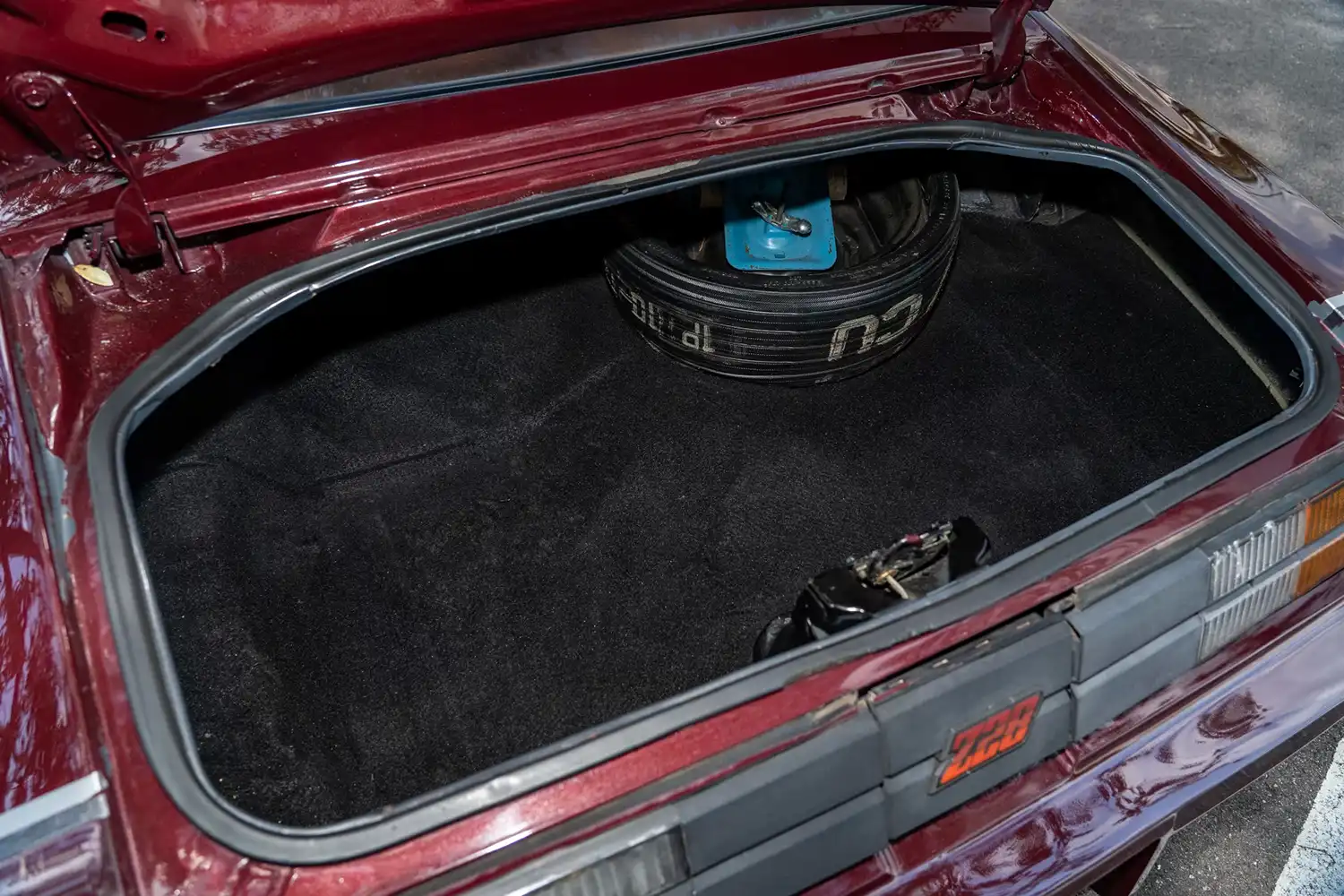 Striking Exterior Design: The exterior of this Camaro Z28 is finished in a rich burgundy color, further accentuated by the iconic Z28 stripes that run along the hood and sides, immediately identifying its performance pedigree. The car rides on rally wheels fitted with Firestone Firehawk white-letter tires, contributing to its sporty stance and period-correct appearance. A rear spoiler adds to the car’s aggressive styling and aerodynamic profile.