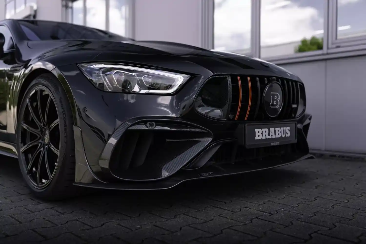 These rims are produced using hi-tech forging technology and cutting-edge CNC machining technology and as a result offer an outstanding combination of light weight and maximum strength. Just as extraordinary are the dimensions of the rims and tires. The front axle features wheels of size 10.5Jx21 with 275/35 ZR 21 tires. Rims of size 12Jx22 with Continental SportContact 7 high-performance tires of size 335/25 ZR 22 are mounted on the rear axle. These wheels are even bigger than those of the production car and benefit the appearance of the BRABUS 930. In addition, they also make the handling even more agile. This effect can be further amplified with the BRABUS AIRMATIC SPORT Unit. The plug-and-play module lowers the ride of the four-door coupe by up to 20 millimeters (0.8 in) depending on the selected driving mode.