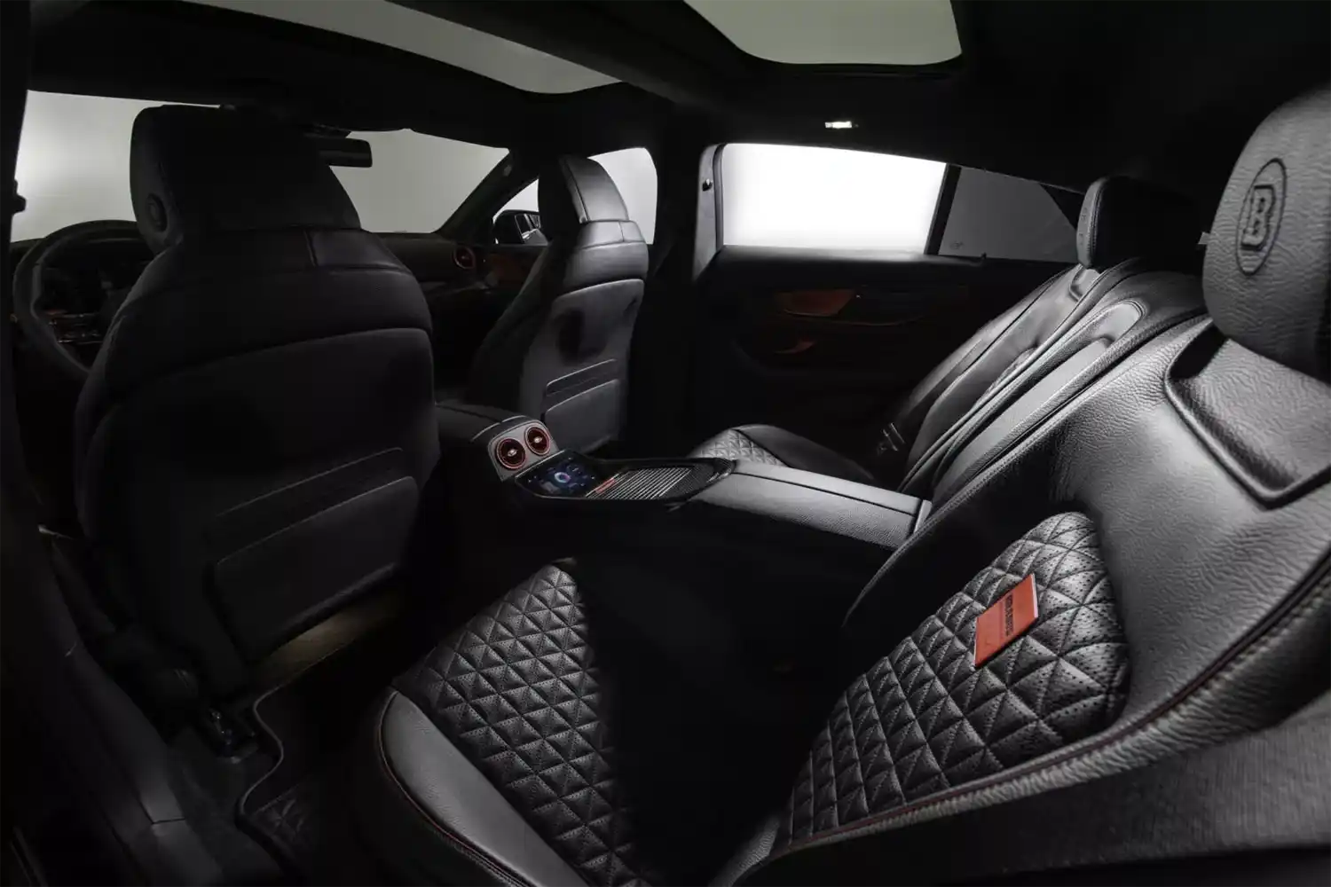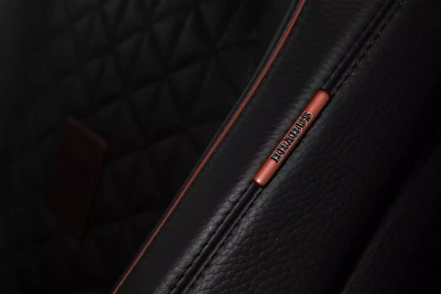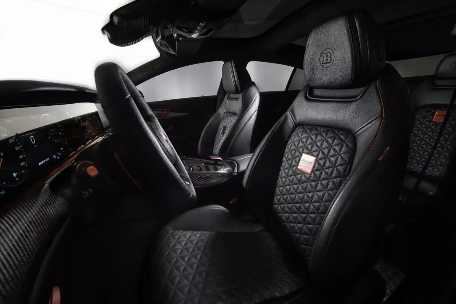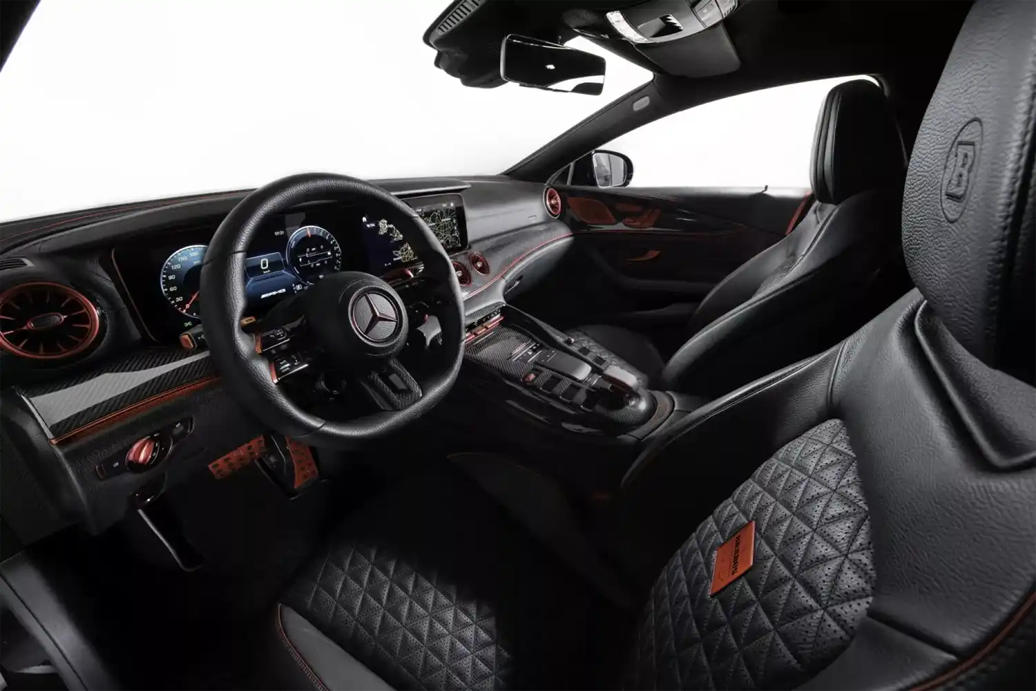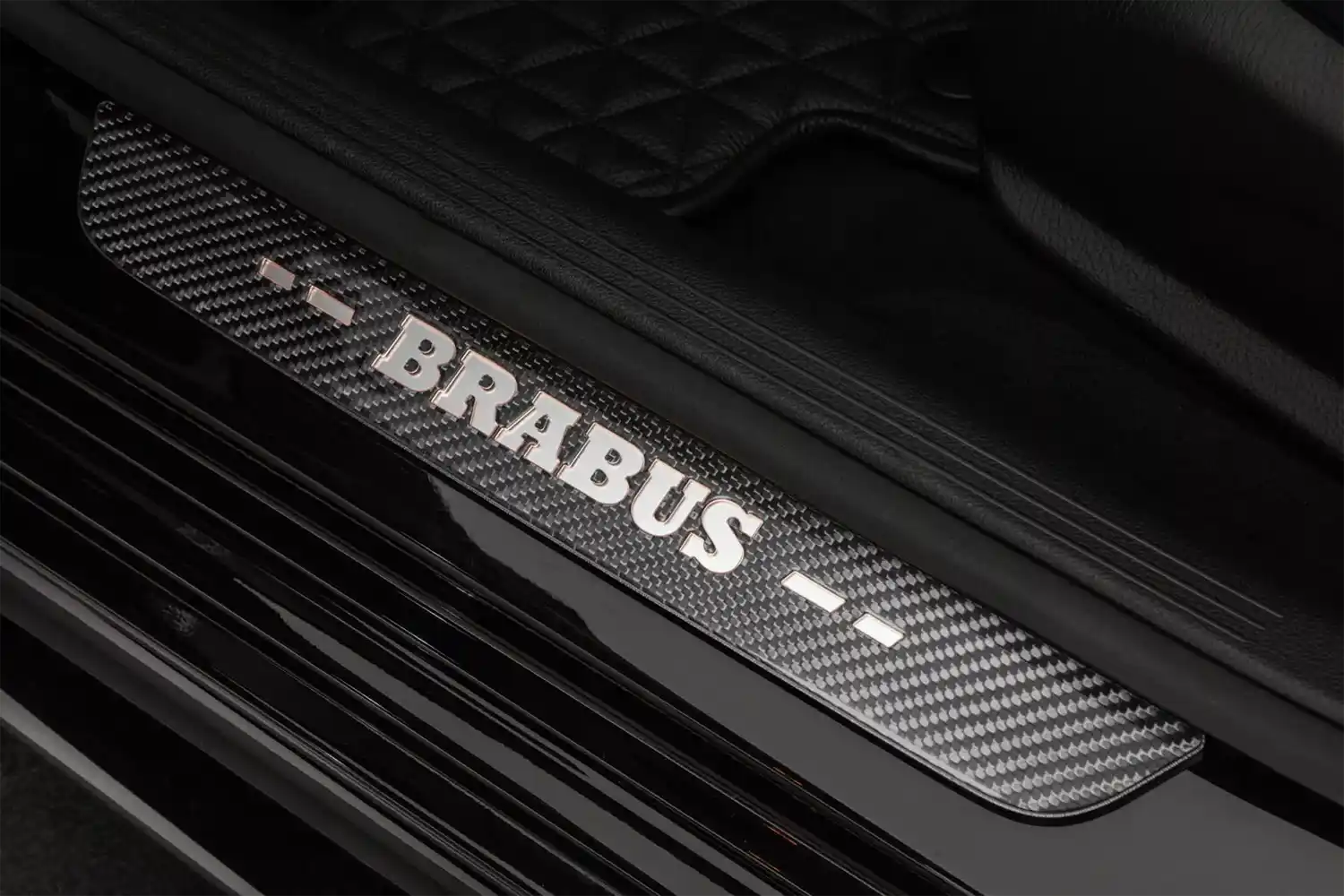 The BRABUS carbon elements in the interior as well as BRABUS door pins and matt anodized aluminum pedals add decidedly sporty highlights. Carbon scuff plates with backlit BRABUS logo that changes colors in sync with the interior ambient lighting round off the innovative interior design. In addition, “ROCKET RED” glazing was applied to numerous cockpit elements from switches and speaker covers to air vents and bezels.