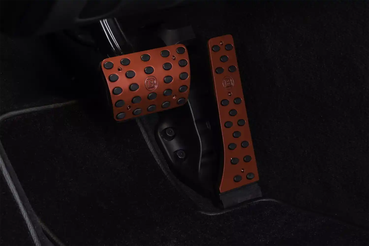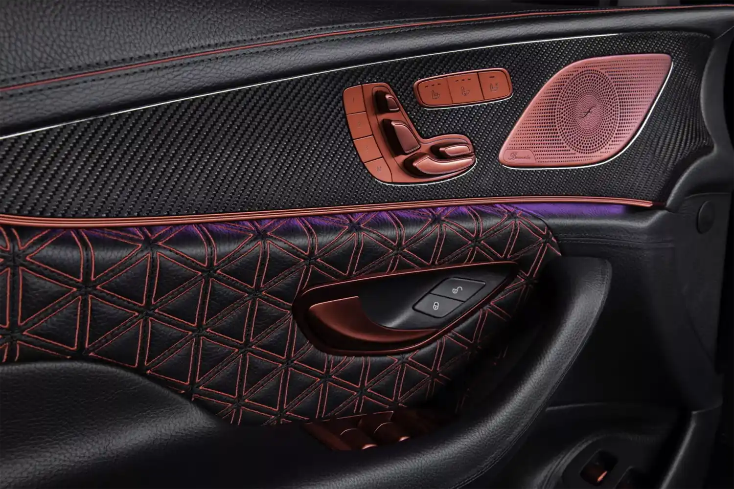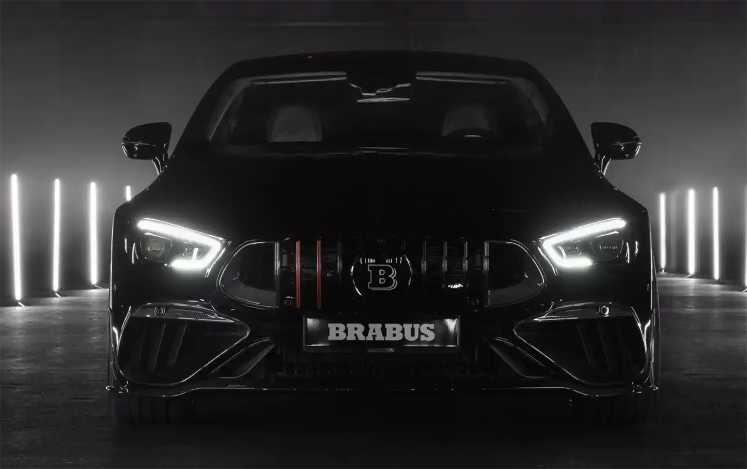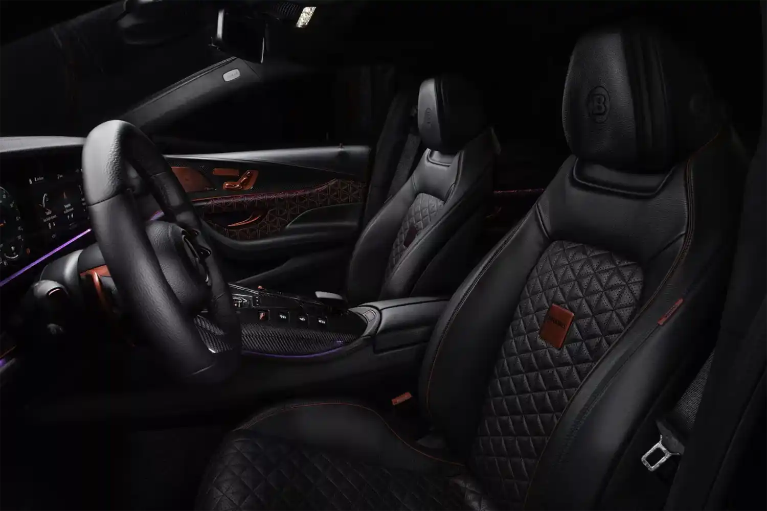 The BRABUS carbon elements in the interior as well as BRABUS door pins and matt anodized aluminum pedals add decidedly sporty highlights. Carbon scuff plates with backlit BRABUS logo that changes colors in sync with the interior ambient lighting round off the innovative interior design. In addition, “ROCKET RED” glazing was applied to numerous cockpit elements from switches and speaker covers to air vents and bezels.