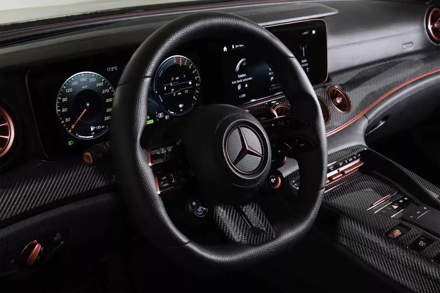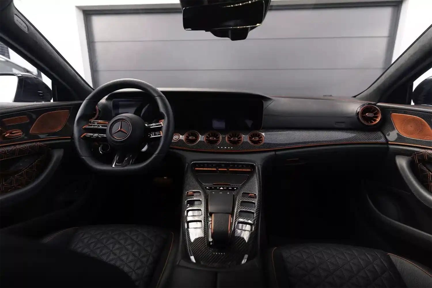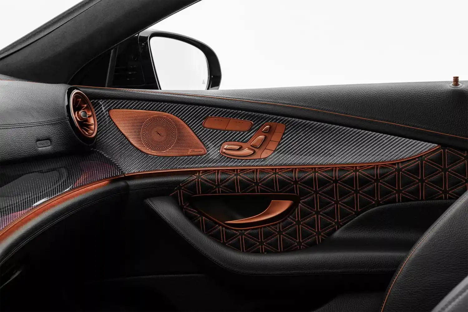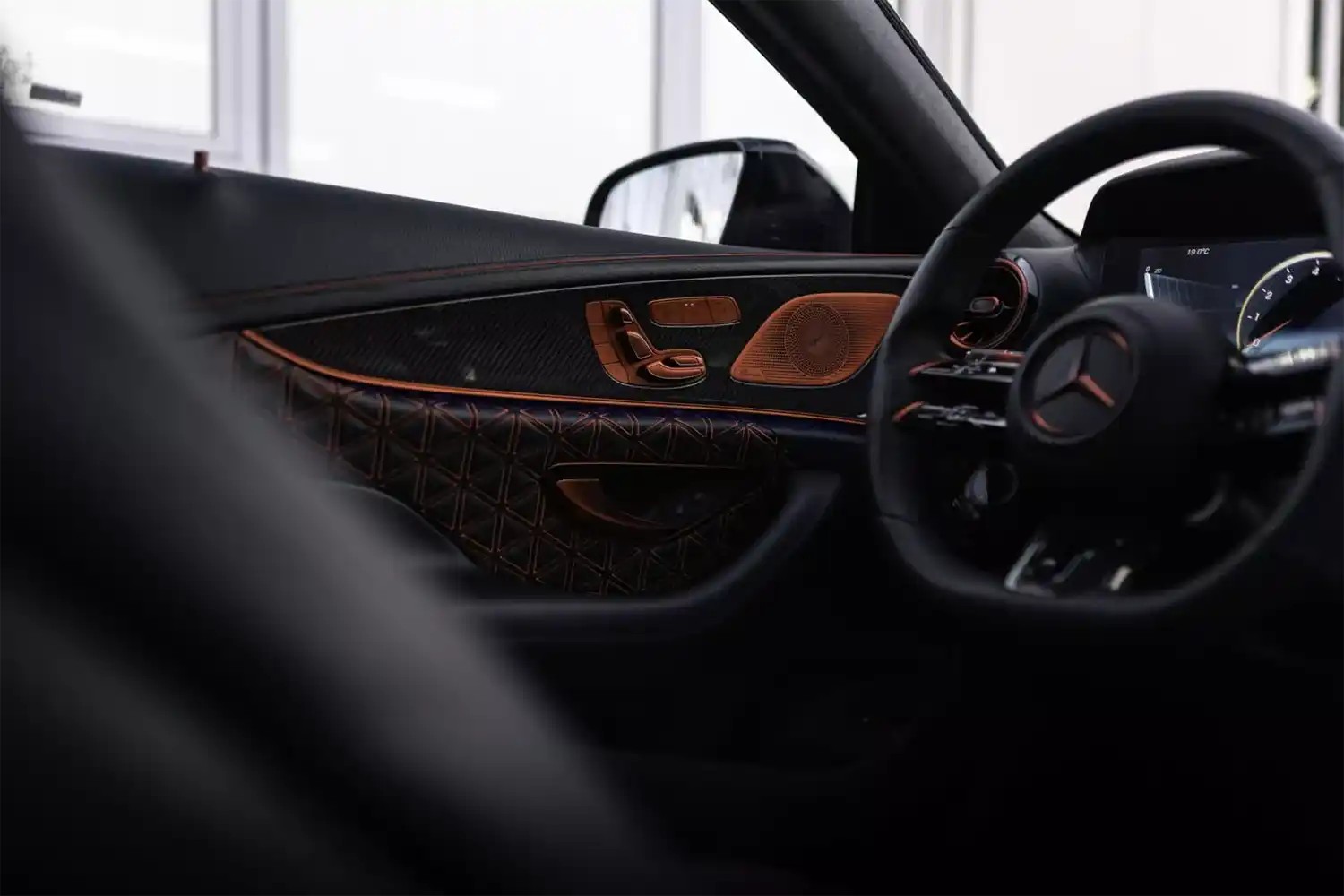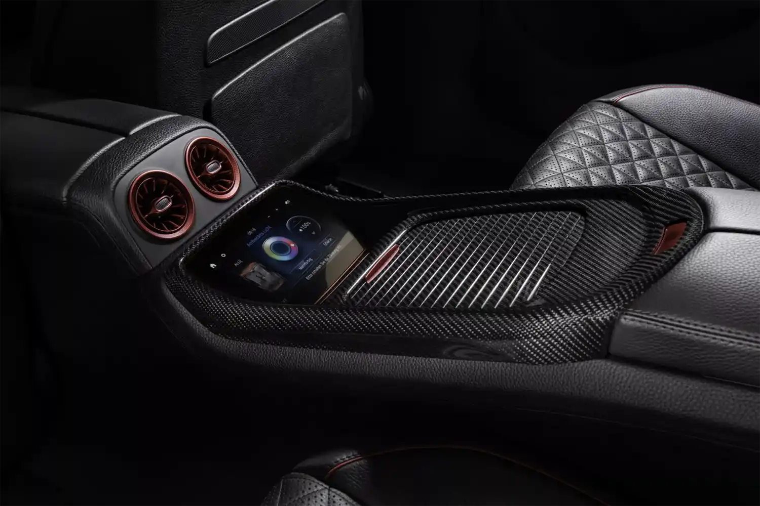 The BRABUS carbon elements in the interior as well as BRABUS door pins and matt anodized aluminum pedals add decidedly sporty highlights. Carbon scuff plates with backlit BRABUS logo that changes colors in sync with the interior ambient lighting round off the innovative interior design. In addition, “ROCKET RED” glazing was applied to numerous cockpit elements from switches and speaker covers to air vents and bezels.