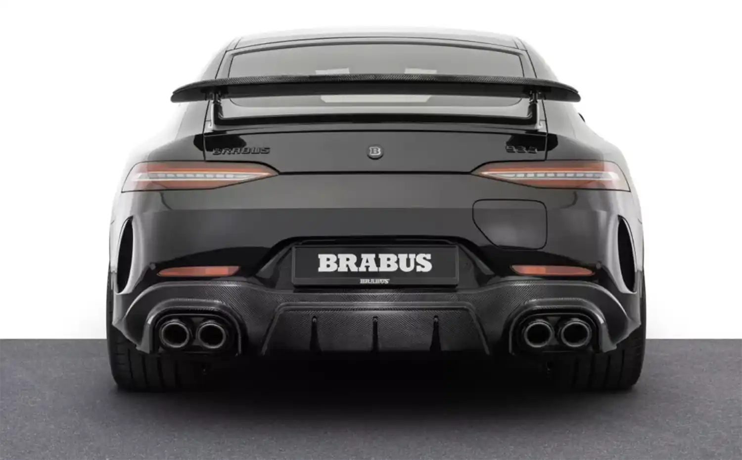The rear end of the four-door is given an even sportier styling as well. The carbon diffuser insert for the rear fascia perfectly frames the four tailpipes of the BRABUS sports exhaust. The dynamic appearance of the bodywork is rounded off by the BRABUS carbon covers for the side mirrors.