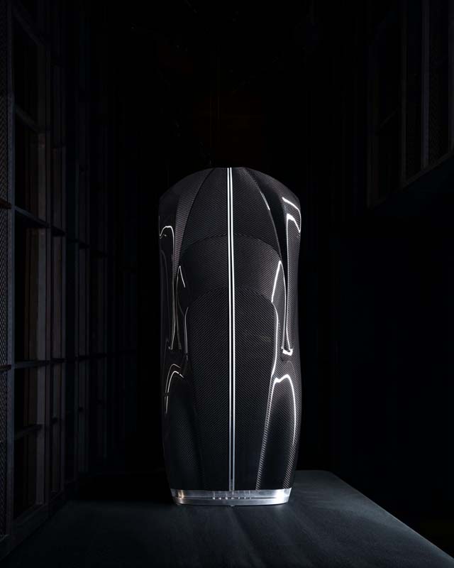 A 15-liter carbon fiber bottle, itself the result of 150 hours of craftsmanship involving 37 steps, nestles securely within a sculptural case, which draws inspiration from La Voiture Noire and the flowing elegance of the Type 57 SC Atlantic. With pure surfaces and clean lines, the visual flow of the hand-crafted case is entirely uninterrupted, except by the ultrafine fiber structure hidden beneath the deep glossy black surface.