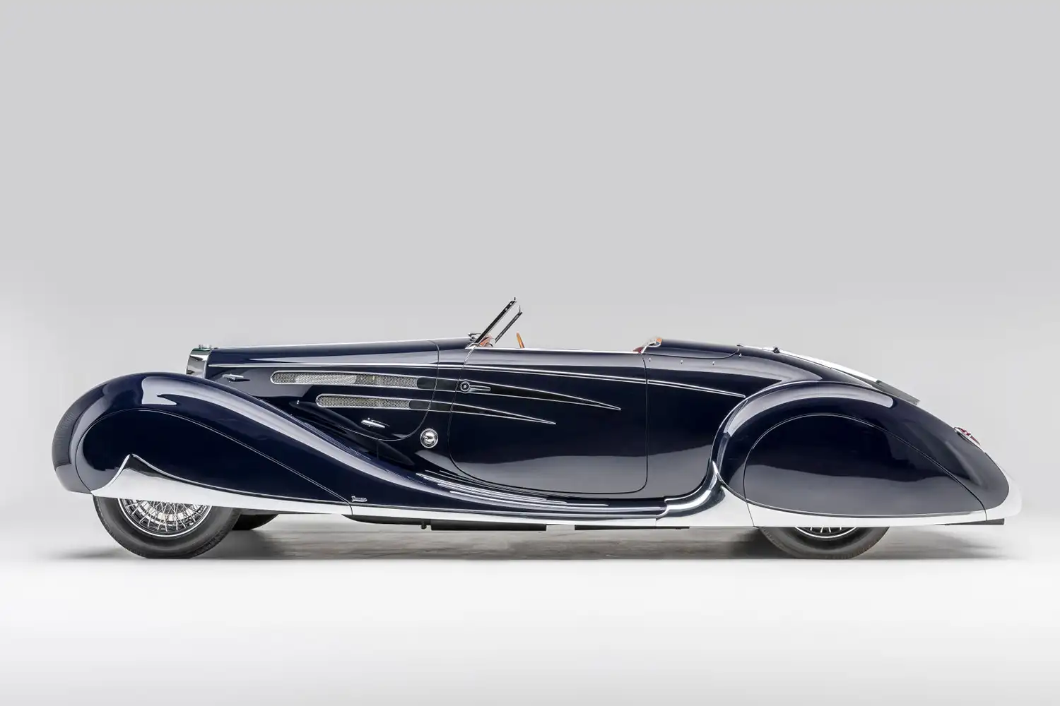 A true one-of-one tour-de-force, the ‘Shah’ wraps a supercharged 3.3-liter twin-cam straight-eight engine in a dramatic body from Vanvooren of Paris designed in the style of Figoni et Falaschi, one of the most progressive coachbuilders of the day. Sold out of the Shah’s Imperial Garage for a sum equivalent to $275 in 1959, the ‘Shah’ tragically remained hidden from public gaze until full restoration in 1983.