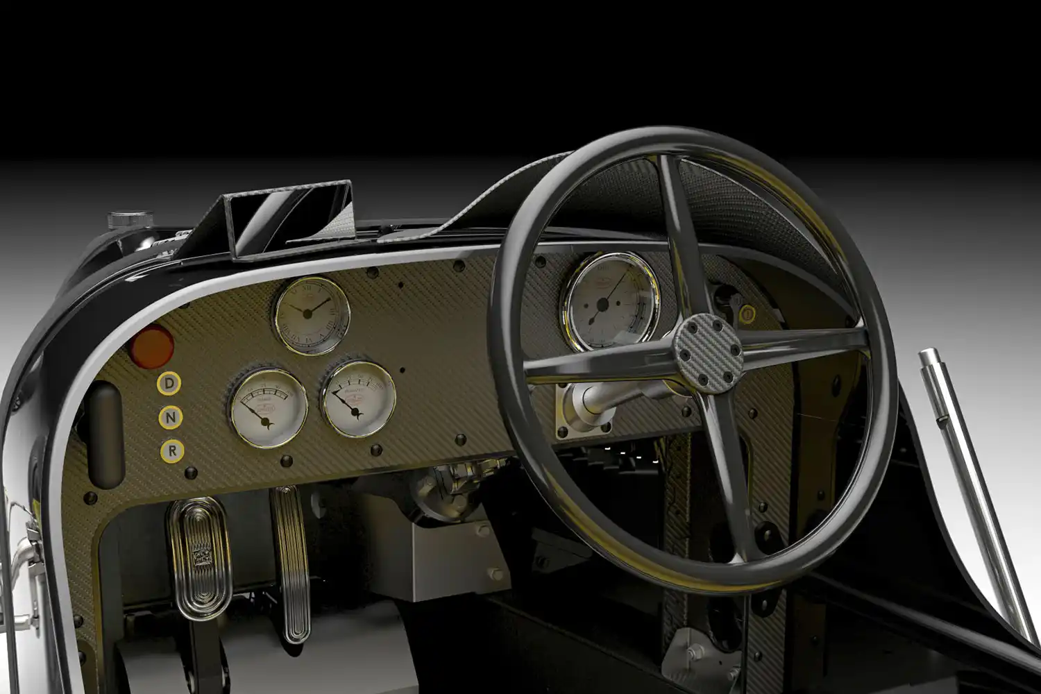 The adjustable pedals are machined from solid aluminum billet and proudly display the famous ‘EB’ logo, while the fuel pump handle has been exactly reproduced, but in this iteration it serves as the forward, neutral and reverse selector.