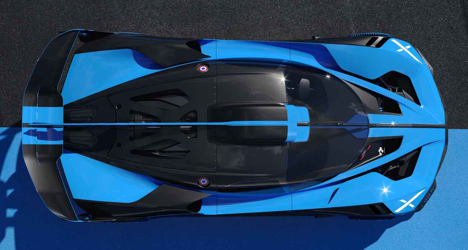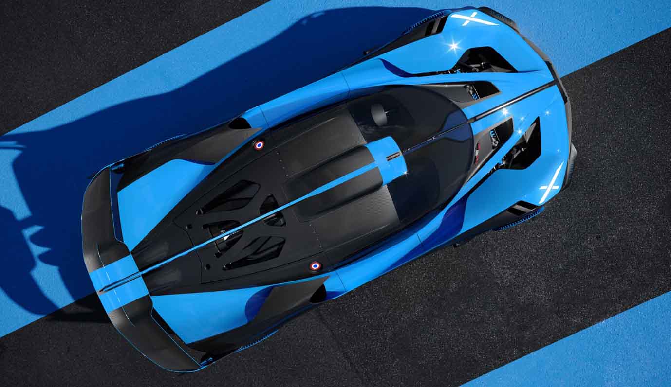 As with other Bugatti vehicles, the Bugatti design team also makes use of a colour split in the Bolide. Compared with other models, the share of visible carbon parts is increased by up to 60 percent. Only around 40 percent of the surfaces are painted – in a re-interpretation of the historic French Racing Blue.