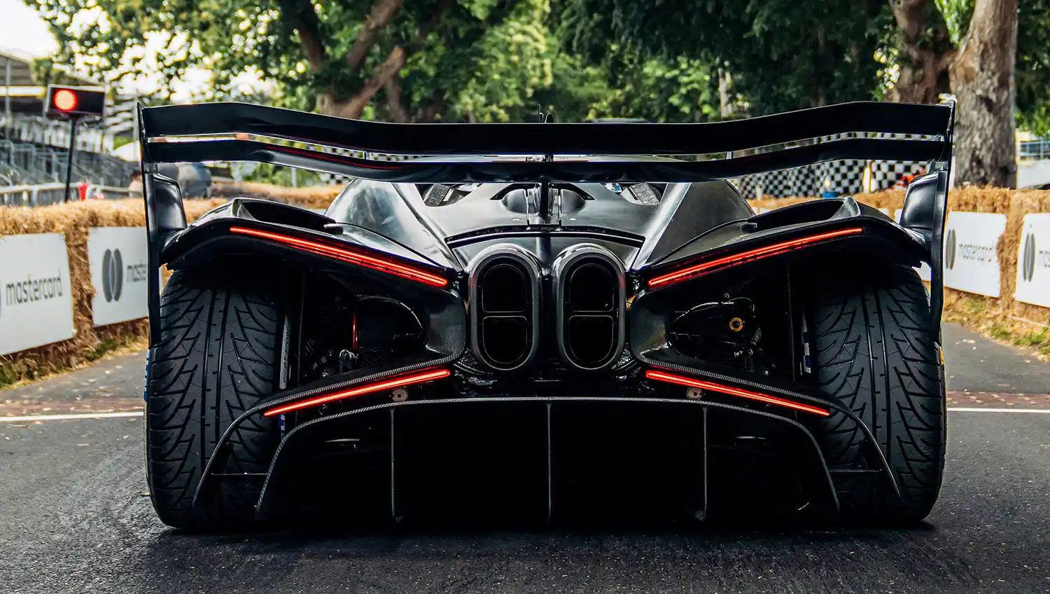 As in Formula 1, the Bolide decelerates with racing brakes with ceramic discs and coatings. The brake callipers weigh only 2.4 kilograms each. The front forged magnesium rims with central lock weigh 7.4 kilograms, while the ones at the rear weigh 8.4 kilograms – with a very wide tyre size of 340 millimetres on the front axle and 400 millimetres on the rear axle (Chiron: 285 mm at the front and 355 mm at the rear). A compressed-air-driven jack system with four rams makes tyre changing easier, a quick refuelling system allows pressure refuelling.