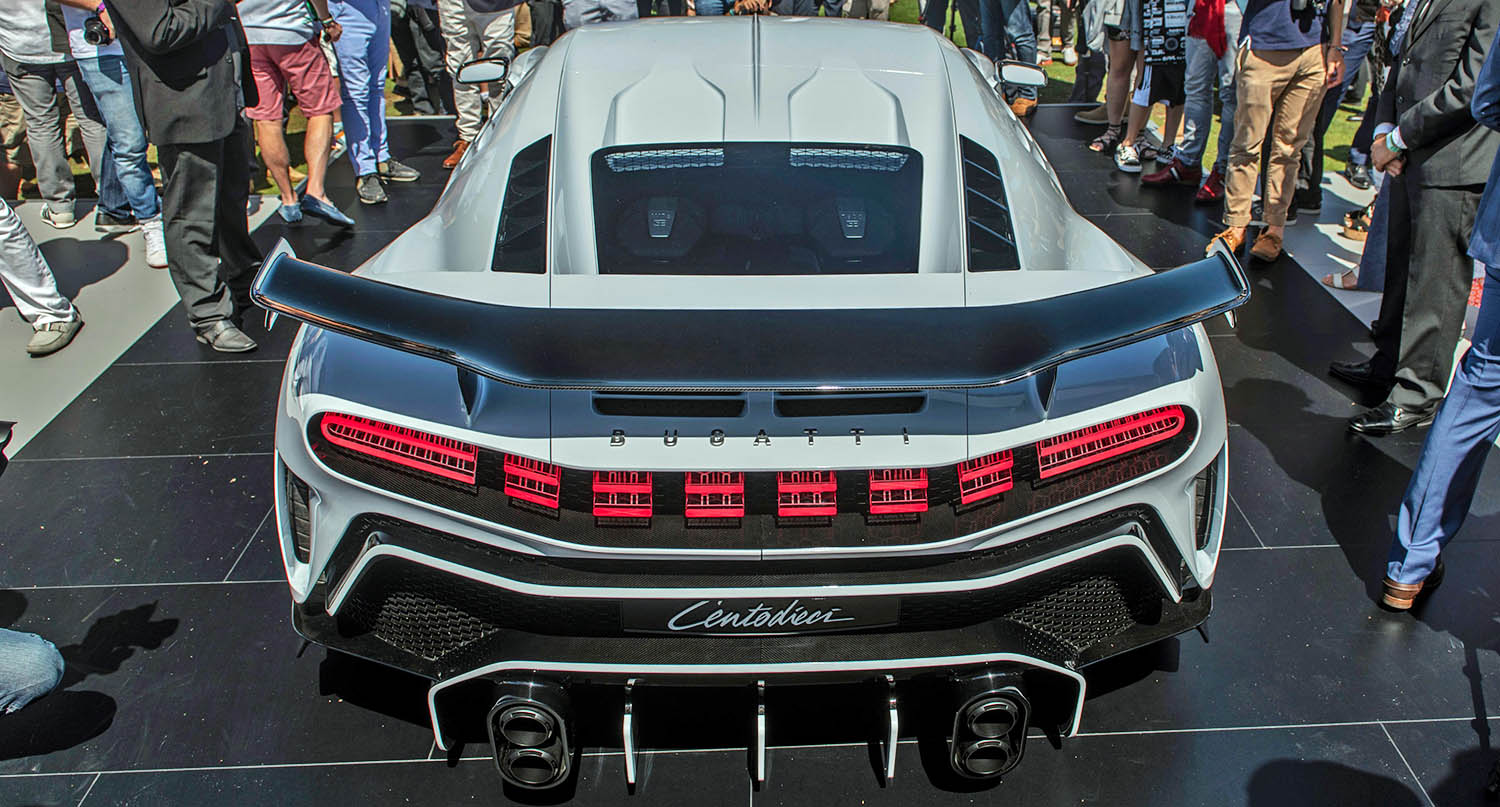Instead of the graphic two-dimensional rear of the EB110 with its two pill-shaped tail lights, the Bugatti Centodieci relies on a wide air outlet opening for more efficient engine thermals, bringing to life the flying tail light elements in graphic kinship with the EB110. It took several months to develop solutions to ensure a balanced temperature. As in the EB110, the engine is seen behind a transparent glass surface. The rear is formed into a single ventilation hole, characterised by the eight rear light elements, 2+2 exhaust tailpipes positioned on top of each other in a black matt anodised finish and a performance diffuser to improve downforce. The overhanging rear wing is permanently attached in the style of the original EB110 SS. This increases the downforce. Downforce is supported by the aerodynamic tailgate and a laminar flow-optimised rear window.