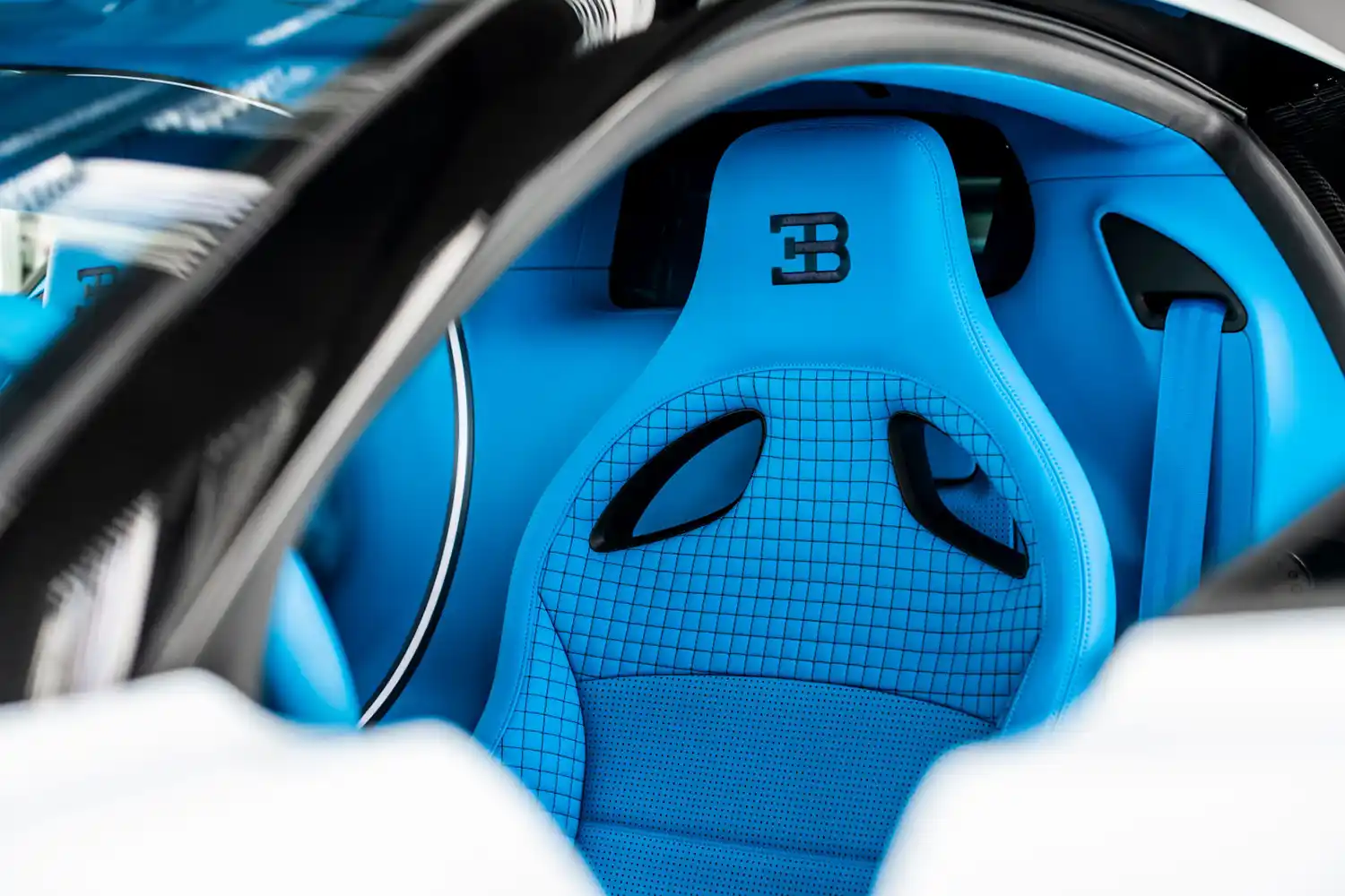 The last of 10 hand-built units, this Centodieci contrasts a Quartz White exterior with a Black Carbon finish across the lower body and Black Matt grilles. The brake calipers – in Light Blue Sport – as well as Light Blue Sport finishing for the logo on the Black Carbon rear wing, establish a deep connection with the EB110, reimagining the famous shade of Bugatti Blue that the car was introduced and produced in.