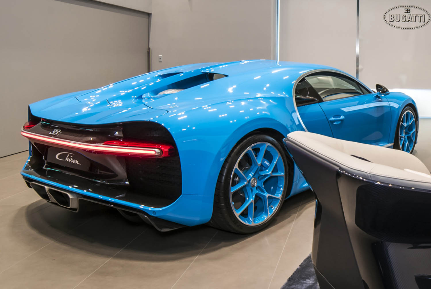 The most distinctive design features of the Chiron are the Bugatti horseshoe with the eight-eyed front end, the C-bar on the side (also known as the “Bugatti line”), which is also used as a design element in the interior, the central fin as a reminiscence of the central seam on the Bugatti Atlantic, which extends over the entire vehicle to the rear, and the redesigned rear end with the newly developed rear light, which is unique in the automobile industry and gives the Bugatti Chiron its distinctive Bugatti signature.