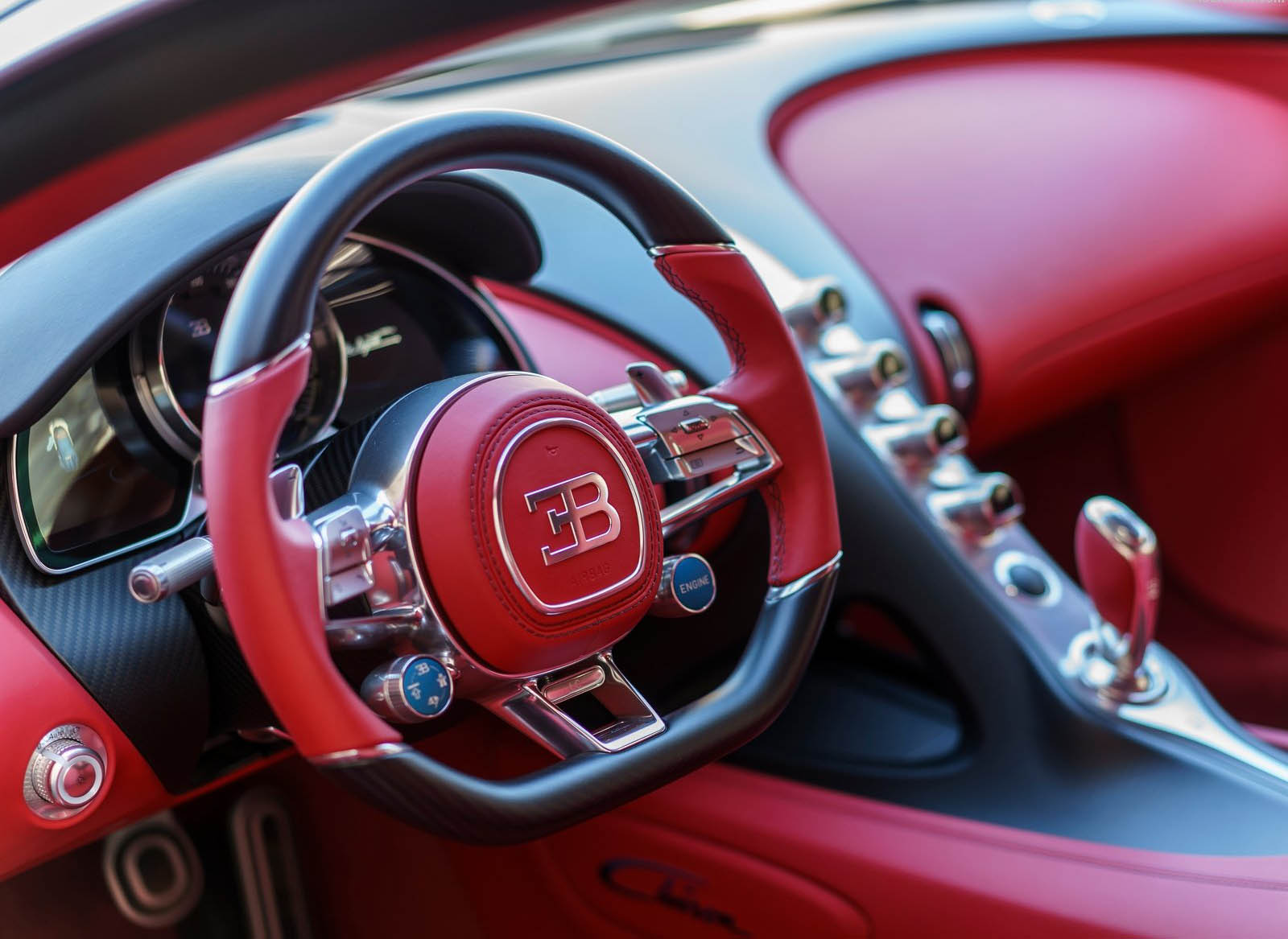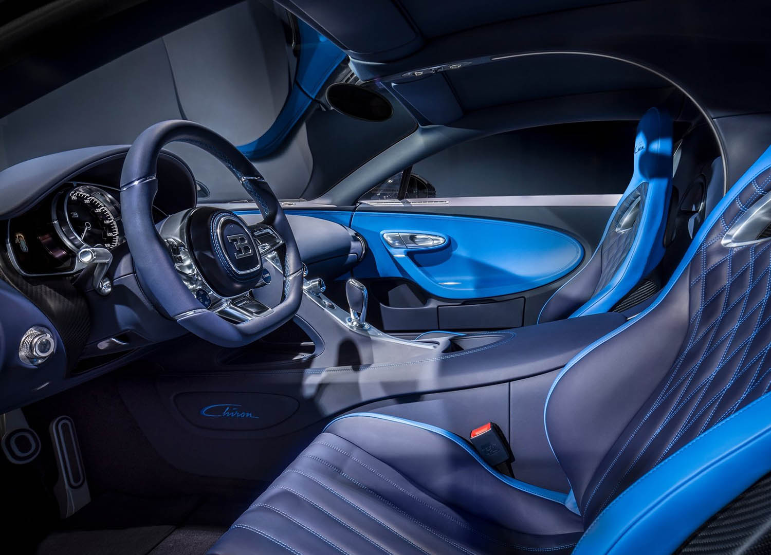 The cockpit layout of the Bugatti Chiron consistently follows functional requirements. In order to keep the central console as slim as possible and to allow a spacious impression, the climate control and infotainment systems have been separated. The units on the central console have independent displays. The selector for the seven-speed dual-clutch gearbox is located in the perfect ergonomic position within easy reach of the driver’s hand. It is produced from the most exclusive materials available and all aluminium parts are milled from solid material. Bugatti is the only carmaker to use anodised aluminium for its controls and to ensure that each individual graphic symbol is illuminated.