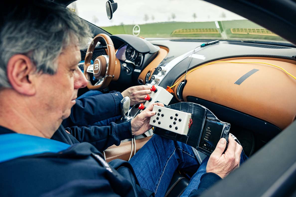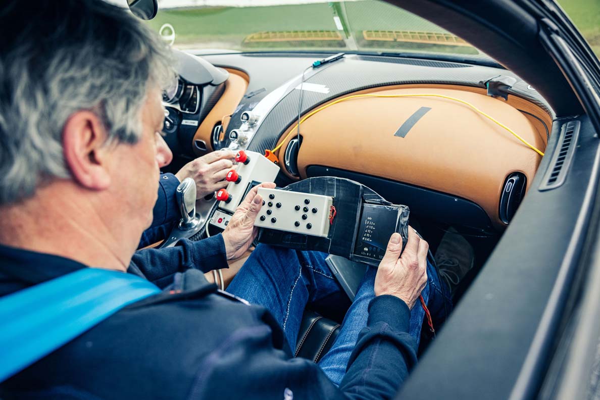 Test engineers tend to develop a prototype for a specific task then test their systems until shortly after the start of production, after which the vehicle is disposed of. But not so with the “Four five.” The four stands for “prototype” and the five stands for the fifth prototype of the Chiron. In all, eight prototypes were created, each built by hand and featuring many custom-made parts. Starting in 2013, all of the Chiron’s software is developed and tested in the 4-005. This involves some 30 vehicle control units undergoing a specific test procedure following a modification, first on the test bench and subsequently in the vehicle. When modifications are made, the engineers also monitor the condition and therefore the quality.