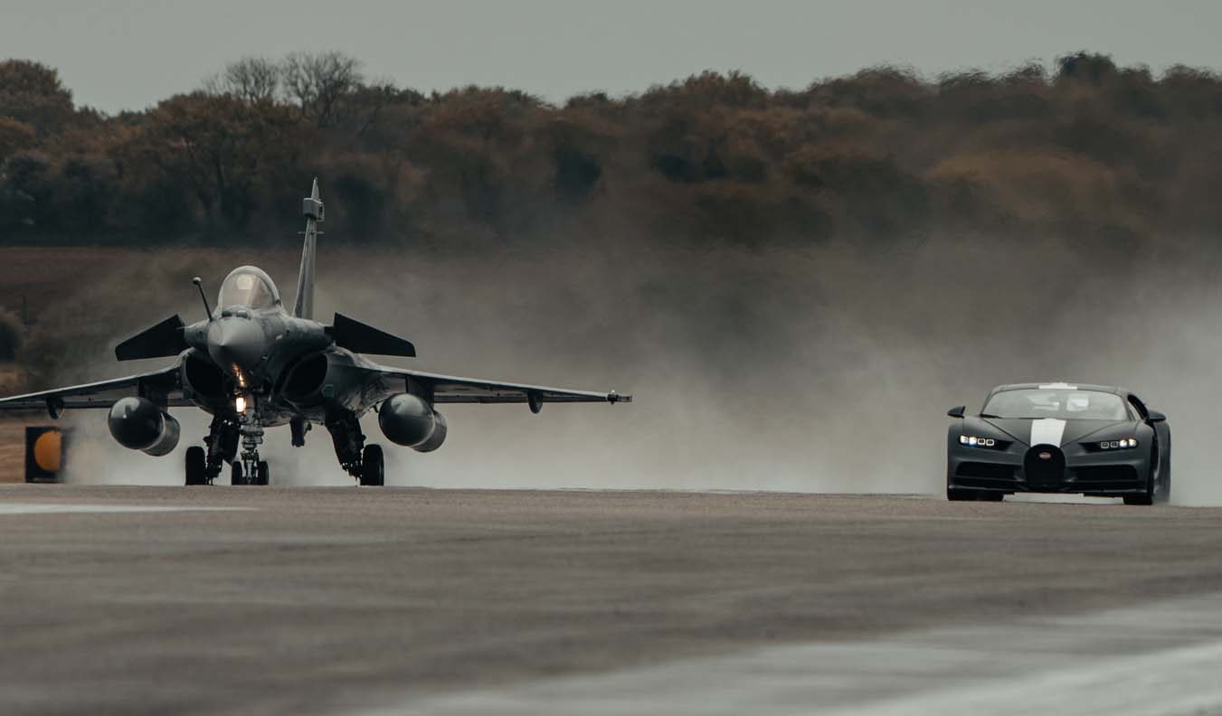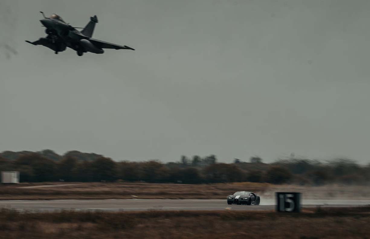 Returning to the scenario at hand: the Bugatti Chiron Sport takes the lead soon after setting off. The hyper sports car accelerates from 0 to 100 km/h in 2.4 seconds and to 200 km/h in 6.1 seconds. It takes 13.1 seconds to hit a speed of 300 km/h and 32.6 seconds to accelerate to 400 km/h, a speed at which pilot, Etienne, and the Rafale Marine look to match to take off.