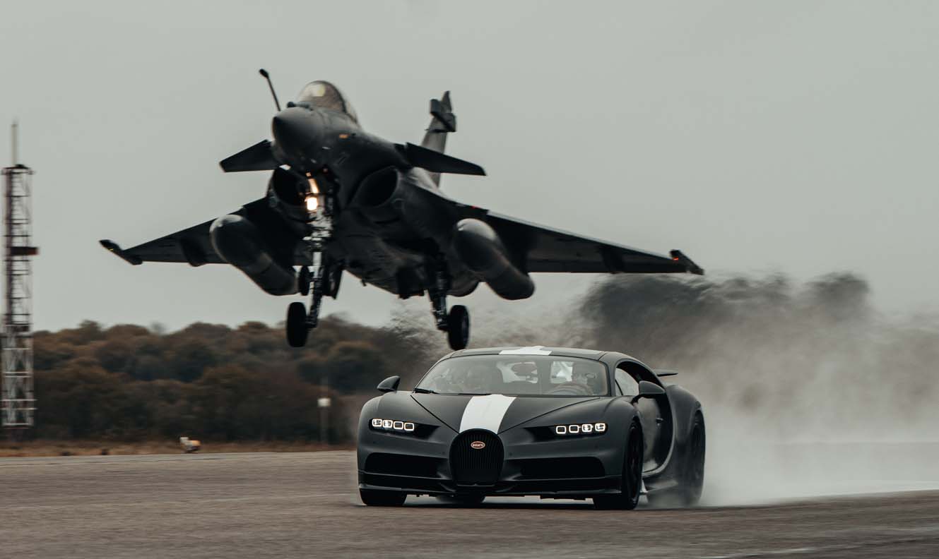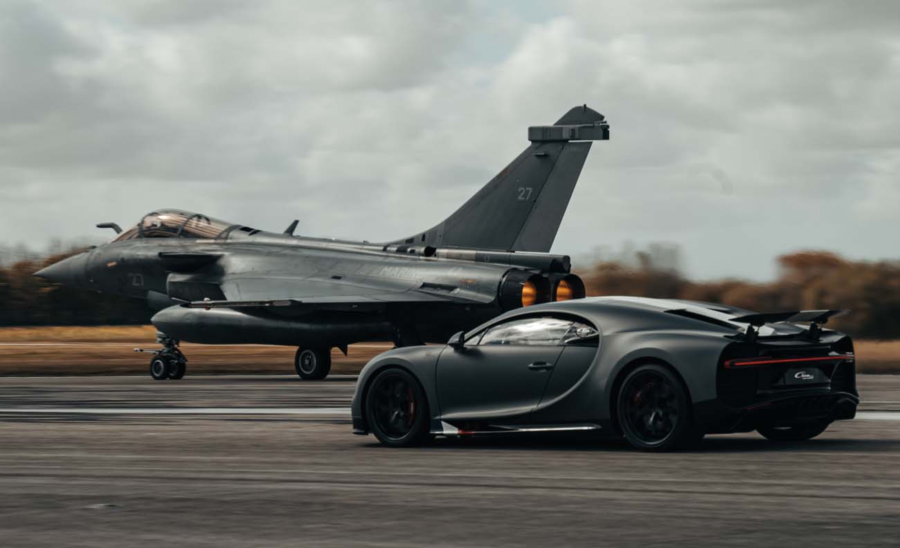 With its outstanding performance and incredible top speed, the Bugatti Chiron Sport is almost peerless in the automotive world. A Bugatti has gone toe-to-toe with a jet before. A Veyron 16.4 took on a Eurofighter Typhoon in a drag race in 2007. In the current match-up, the Bugatti Chiron Sport and the Dassault Rafale Marine are seeing how they measure up against one another in disciplines like acceleration, torque and braking behavior.