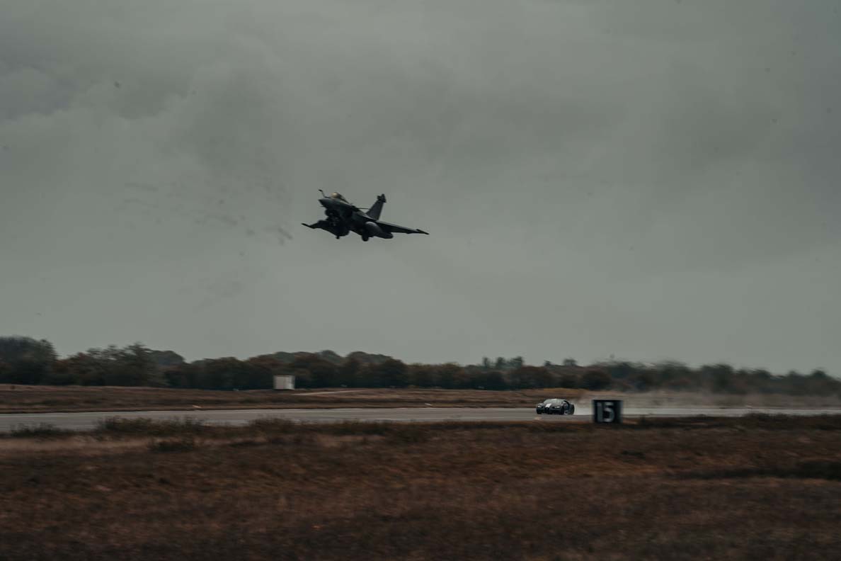 The aircraft hits 165 km/h after 150 meters and 210 km/h after 250 meters, and takes off after 450 meters at around 260 km/h. “I pulled away from the Rafale over the first few hundred meters, but after a few hundred meters more it was around 20 meters above and alongside me in the air. An incredible and fantastic sight,” says Pierre-Henri Raphanel later. To be on the safe side, the Bugatti driver initiates his braking maneuver after approximately 1.5 kilometers and over 350 km/h – by which time the Rafale has disappeared into the horizon.