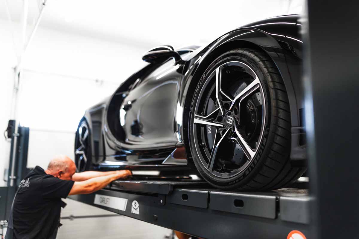A special fastening system was developed together with Bugatti to contain the immense power and strength of the Bugatti Chiron Super Sport. A frame with four individual adapter plates under the carbon monocoque fixes the hyper sports car securely to the dynamometer. 20 high-strength screws on the underbody attach the plates to the monocoque. Each of the plates is attached to the others with crisscrossing strong chains and is anchored to the hall floor. The chains can withstand tractive force of up to 24 tons. Special straps to the sides at the rear fix the hyper sports car in place so that the tires remain permanently in contact with the roller apex.