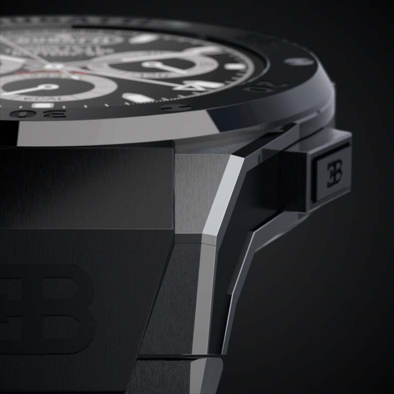 Wide-ranging personalization is central to the Bugatti experience. And so wearer has the option to affix a tailored Bugatti rubber wrist strap for ultimate comfort, or a bespoke titanium strap to complement the titanium theme of the case. The Bugatti Ceramique Edition One Pur Sport, Bugatti Ceramique Edition One Le Noire and Bugatti Ceramique Edition One Divo editions can each be further customized with a unique bezel to reflect the customer’s personal style. The bezel – located at the most exposed point on a watch – is carefully sculpted and milled from scratch-resistant ceramic to the smallest of tolerances, made possible by an ultra-precise CNC process. The bezels for all three models are made of scratch-resistant ceramic, elaborately finished by hand in a production process lasting 20 days. With the special key supplied, the customer can replace a bezel within one minute.