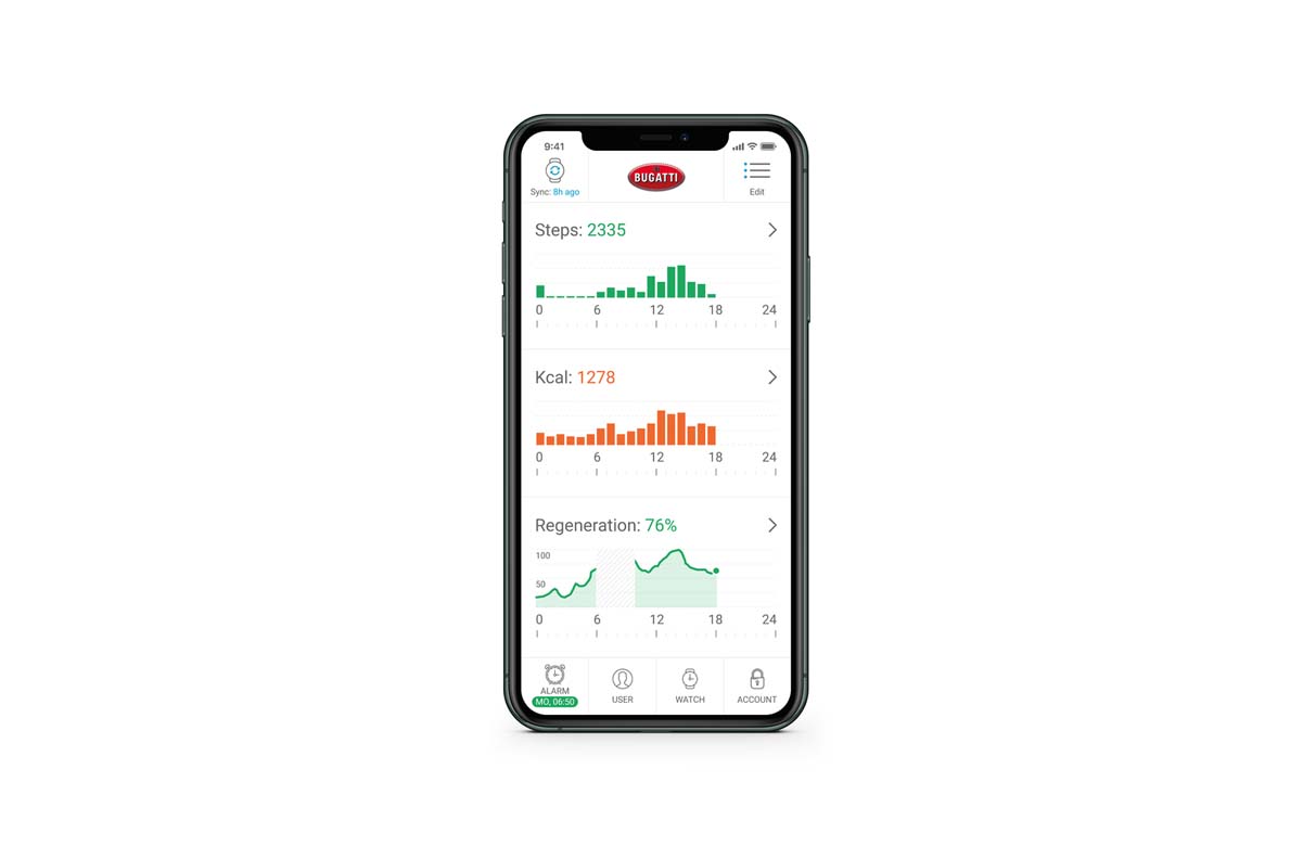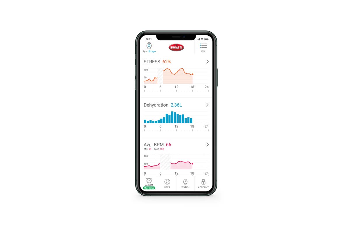 The Bugatti smart-watch is offering almost as many features as the Chiron1 electronic data. Among them the measuring of health data. A new dual-sensor measures both heart rate and heart rate variability to report individual health data. Cardiovascular recovery, training recommendations, biological age and stress level measurements are each generated and supported by VO2Max; the data corresponds for use in over 90 sports.