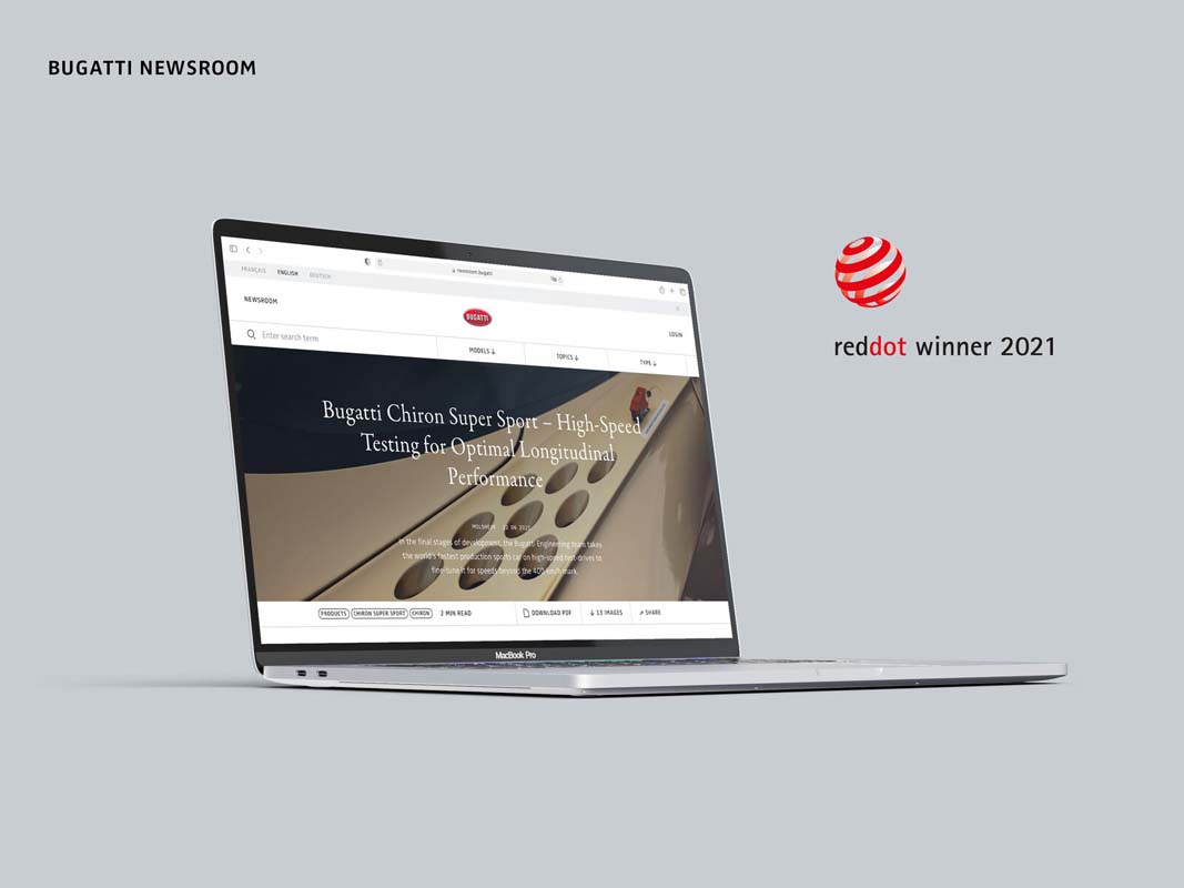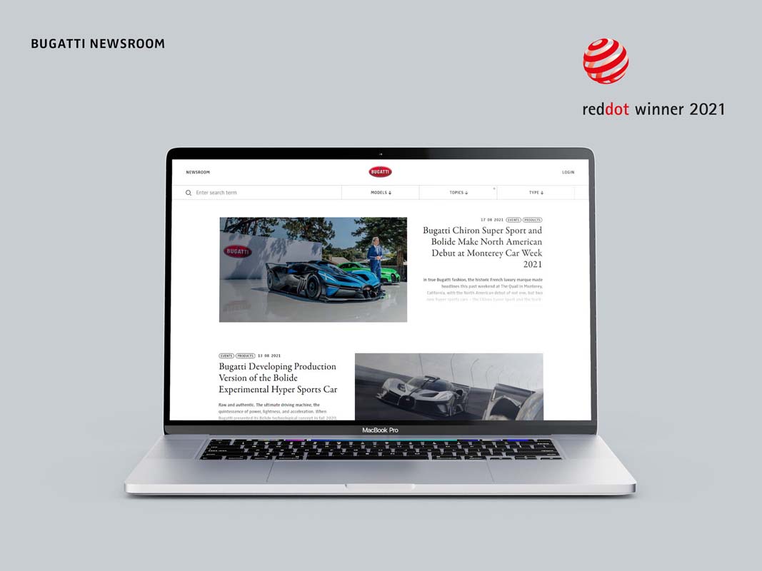 The French luxury brand Bugatti has stood for extraordinary automobiles, technological excellence, outstanding design, and unparalleled quality for more than 110 years. And now it stands for award-winning digital communications, too. Bugatti has won the renowned 2021 Red Dot Design Award in the category Brands & Communication Design for its redesigned newsroom.
