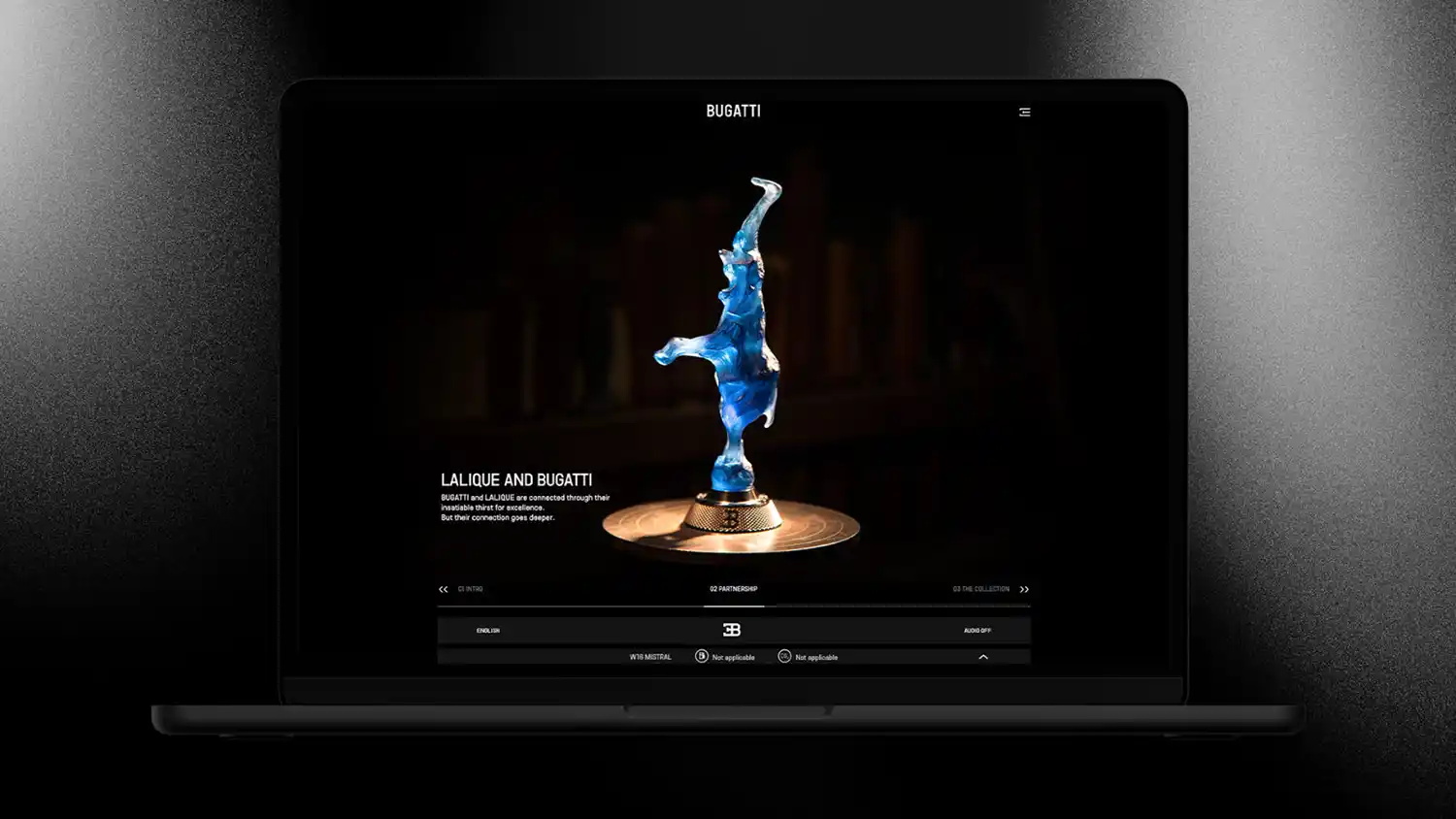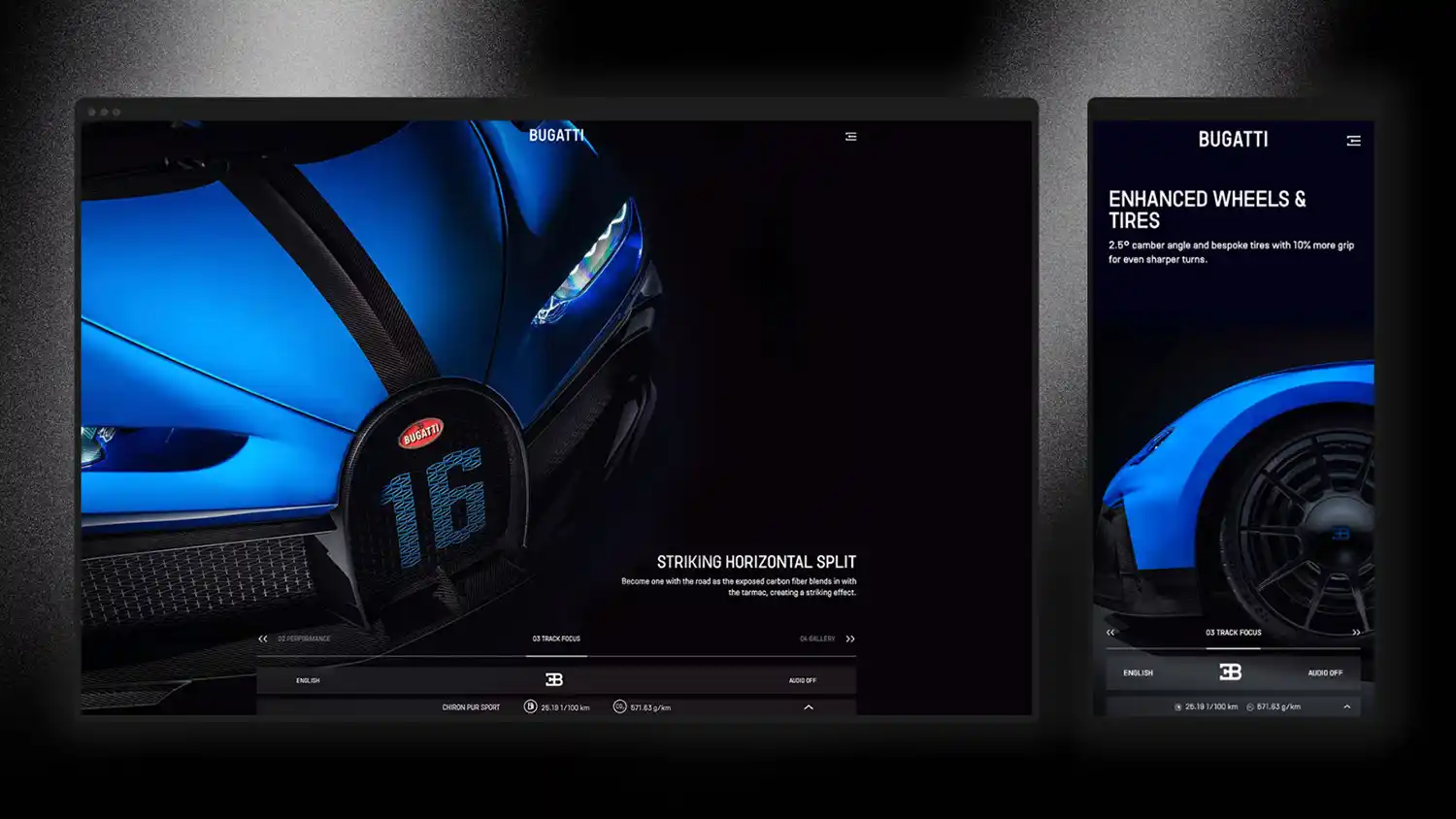 Where most browsers would automatically mute the next page’s soundtrack, the most advanced browsers allow users to click on a new page and continue to hear the sound from the exact second where they left the prior page. This gives the visitor the feeling of remaining on a continuous journey throughout the Bugatti universe. To allow an unrestricted immersion into the new website Bugatti has included various features of this kind.