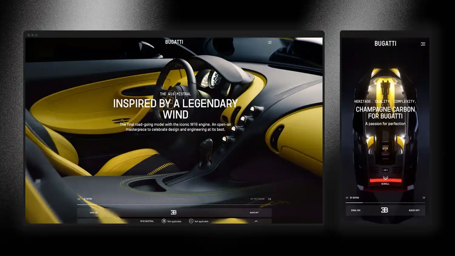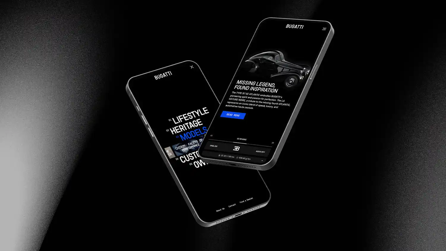 The new site features a dynamic and immersive design that is elegantly integrated into award-winning CI/CD. The new visual language goes beyond static images, putting visitors at the center of its virtual environments, inviting them to embark on a three-dimensional exploration of the brand’s unparalleled ethos. The overall mystic look and feel does not only fit to the brand’s corporate colors but also to its metaphysical technological achievements and the many mysterious stories around Bugatti. By harmonizing sight and sound, the new online home of Bugatti has been crafted to generate genuine engagement, transcending conventional digital interactions.