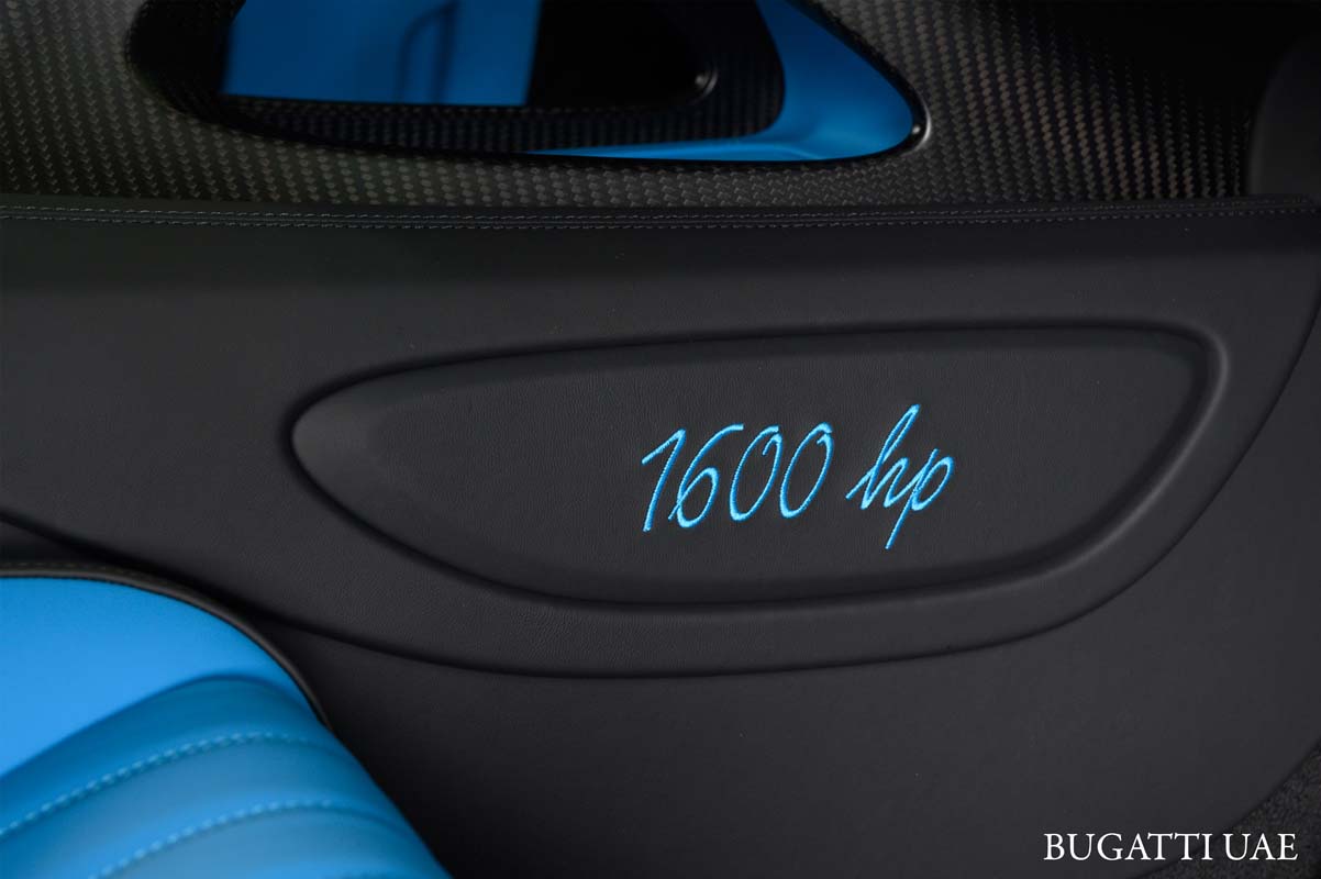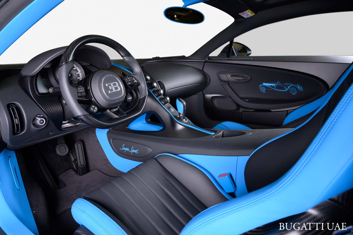 The third Chiron, another Super Sport, and the most recent arrival to the UAE, completes Bugatti’s spectacular Sur Measure triumvirate. Featuring a Matt Blue Royal Carbon exterior, the car is equipped with a special interior split design, having two-tone seats with the colours reversed. The driver’s side is in Light Blue Sport with a Super Sport logo in the same colour, and the passenger side is predominantly Beluga Black, with a decorated 1600 HP light blue sport logo variation. Door panels are stitched with individualised sketches coloured in light blue sport.