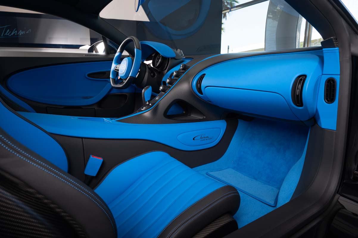 The Pur Sport, which was ordered by another market and delivered to its owner in the UAE, has a blue base too, but this time is overlaid in the Vagues de Lumière style with a lighter tone of the same colour family, called Nocturne Blue. This also took weeks to get the stunning light-fall look, which is more understated than the Pur Sport and invites a second glance (as any Bugatti does) to really see if the effect is created by light or paint. To finish the exterior, each end plate on the rear wing bears the French flag, and the number 9 is painted on the grille.