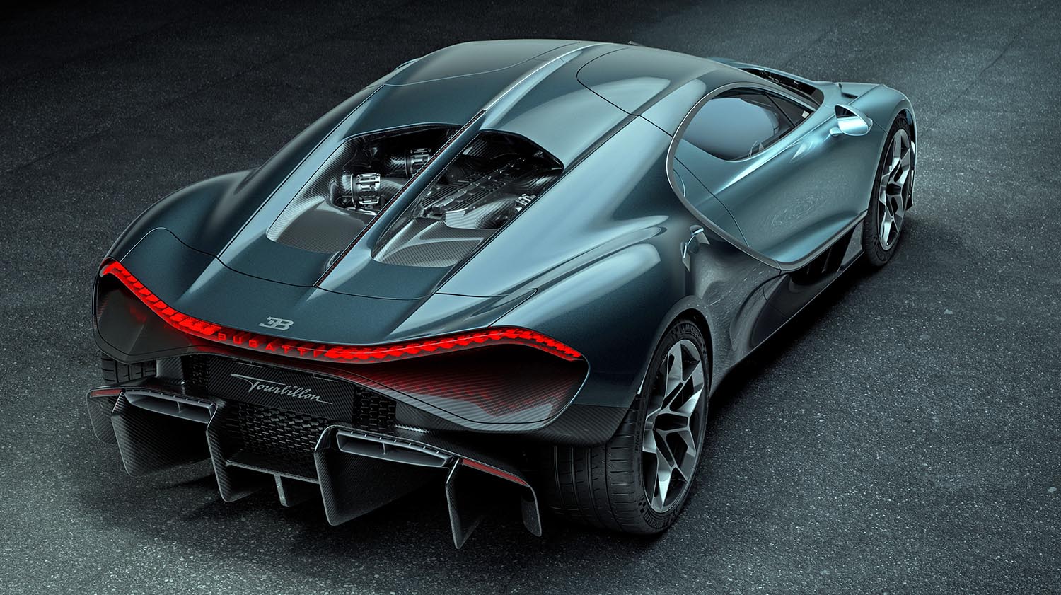 At the rear, the Tourbillon’s fender flows seamlessly into the deck. An active rear wing deploys only when it is needed for performance. Below the wing, the open engine bay showcases the towering plenum of the naturally aspirated V16. More than 124 individual LED elements form a single monobloc tail light. It traces the rear’s contour from edge to edge. The Bugatti script illuminates beautifully at its center.