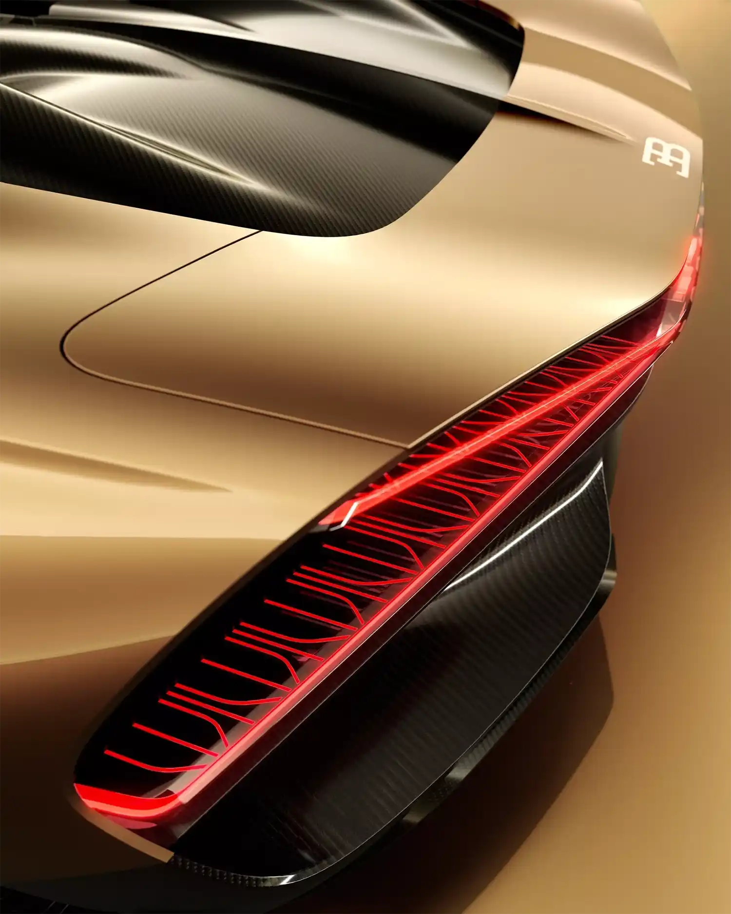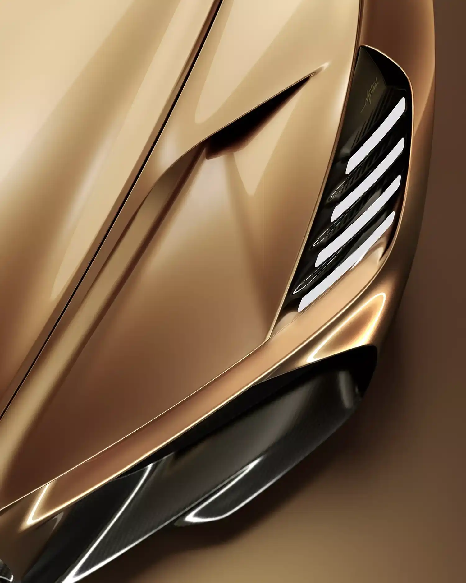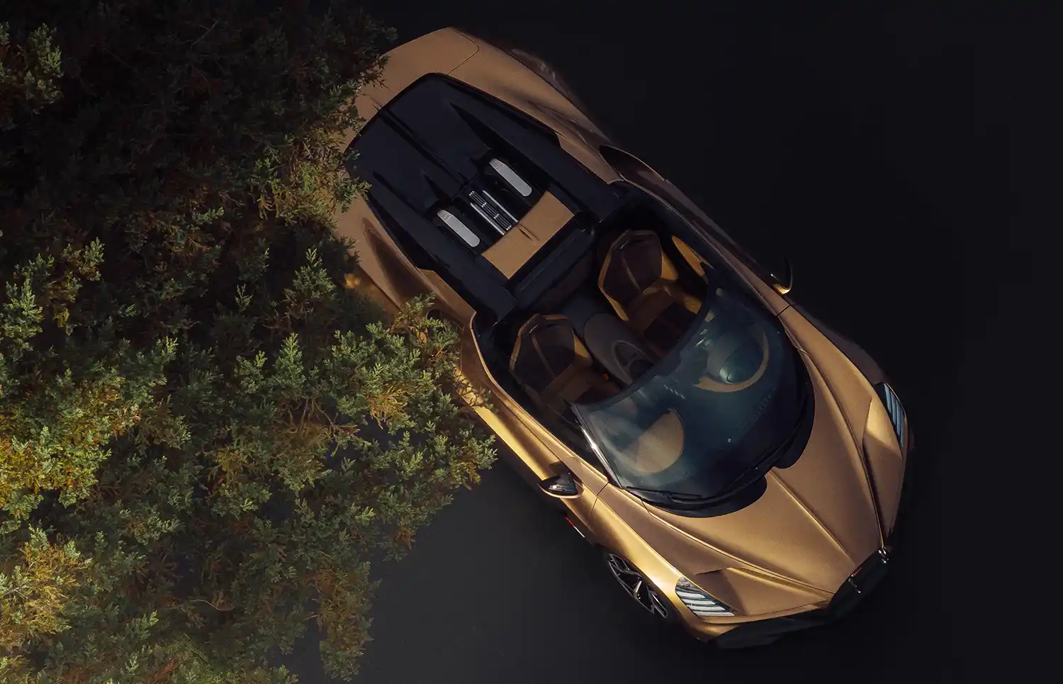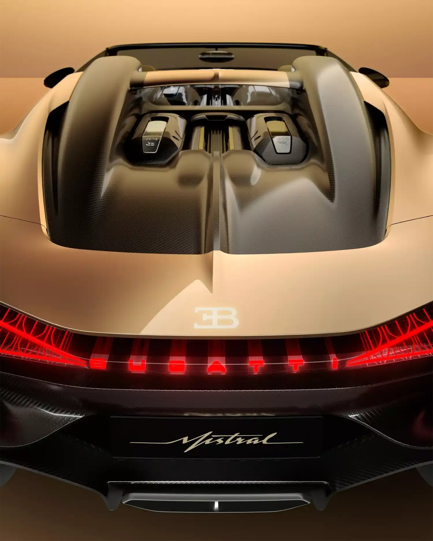 The Mistral comes painted in a golden hue, closely resembling the “Doré” paint designed specifically for the Chiron Super Sport Golden Era, albeit without the black fascia or lavish graphics found on the latter. The lower part of the car’s body is made of exposed carbon fiber, including the engine cover and the dual outlets behind the headrests. The mirrors also feature a carbon fiber weave but with a glossy golden finish.