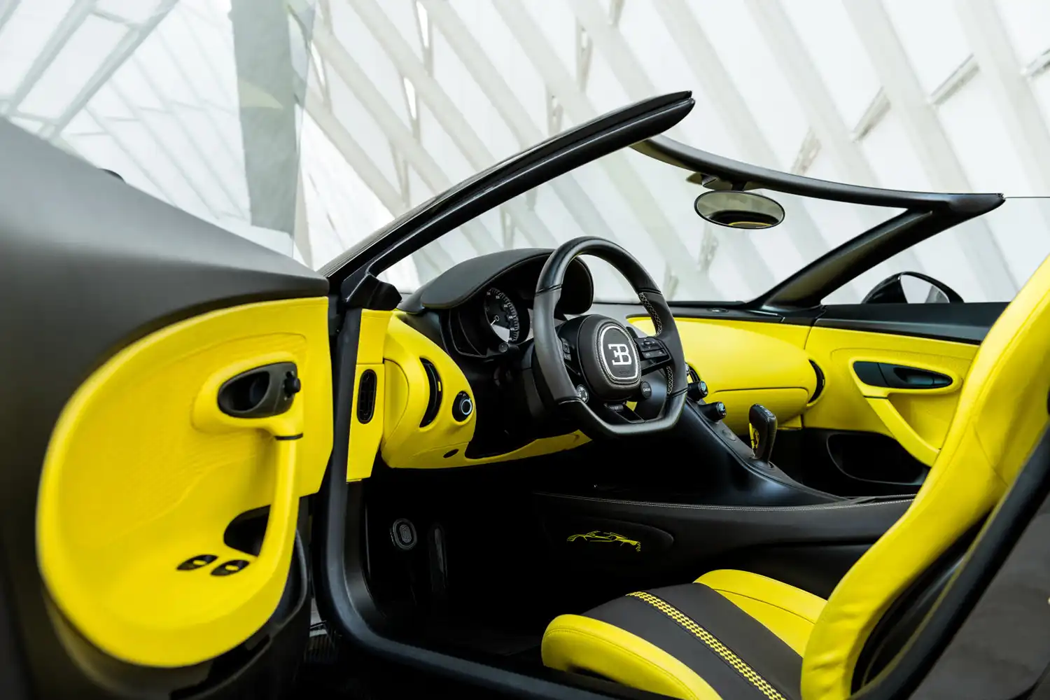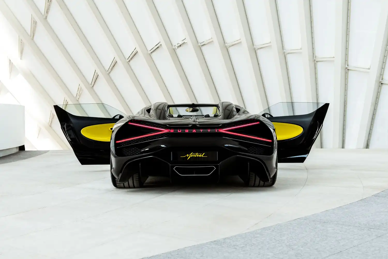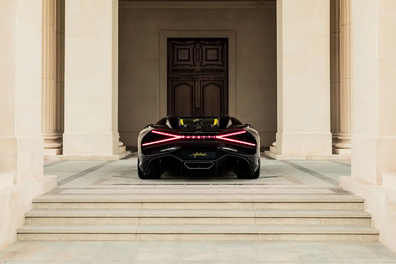 While in the thrilling Saudi capital, W16 Mistral’s first stop was the King Abdullah Financial District, an area of towering buildings structured around a natural green riverbed, known in Arabic as a ‘wadi’. The surroundings perfectly embody the philosophy of the W16 Mistral1 where past meets the future; the ‘X’-shaped taillights hint at the future of Bugatti design, while the black and yellow-themed interior pays homage to the favored colors of the company’s founder, Ettore Bugatti.