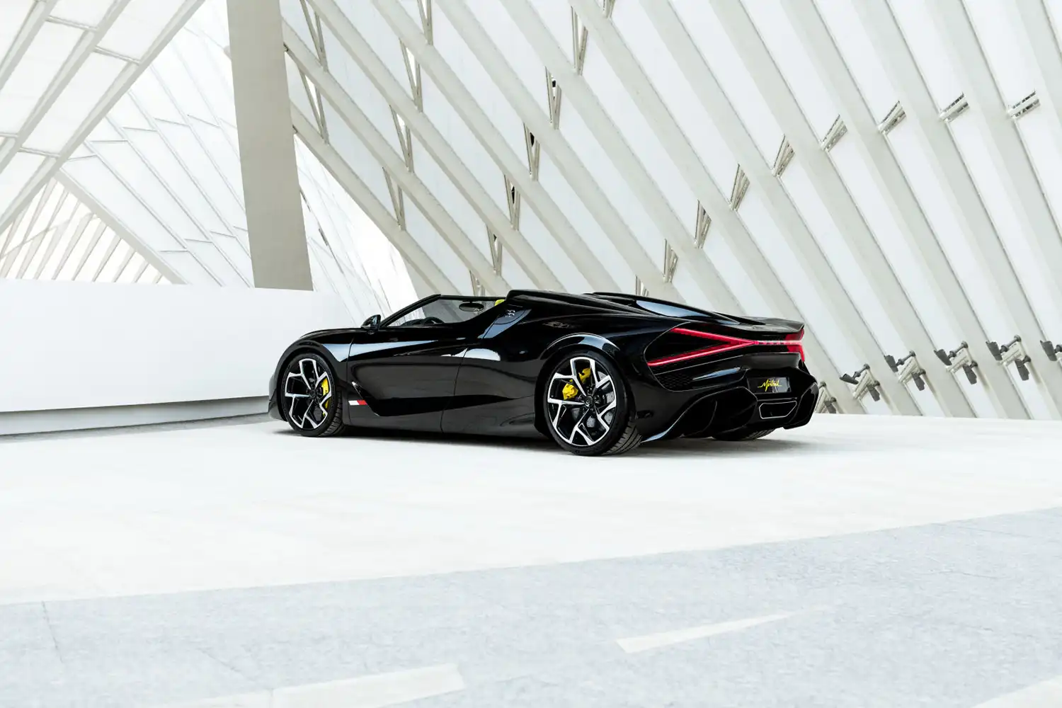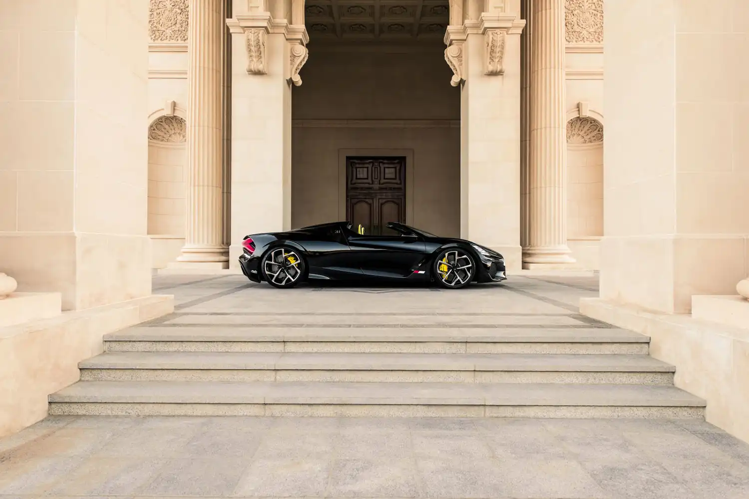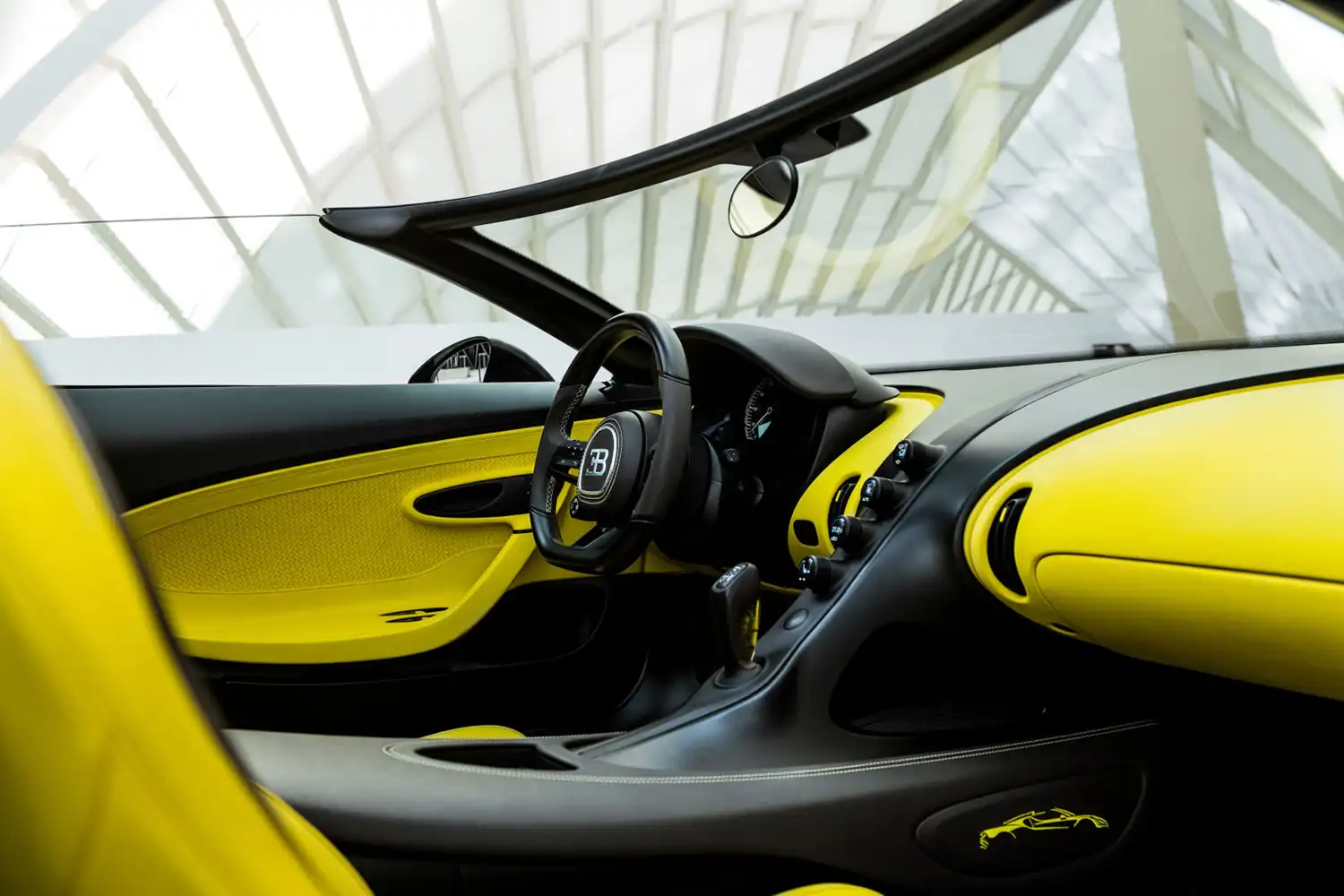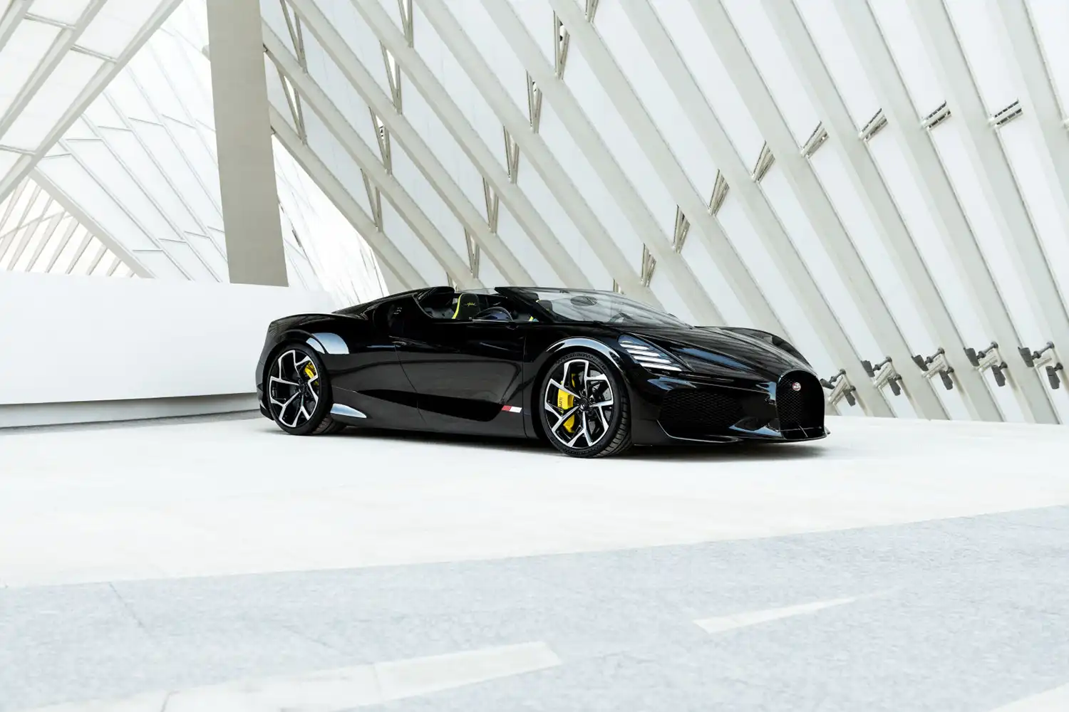 While in the thrilling Saudi capital, W16 Mistral’s first stop was the King Abdullah Financial District, an area of towering buildings structured around a natural green riverbed, known in Arabic as a ‘wadi’. The surroundings perfectly embody the philosophy of the W16 Mistral1 where past meets the future; the ‘X’-shaped taillights hint at the future of Bugatti design, while the black and yellow-themed interior pays homage to the favored colors of the company’s founder, Ettore Bugatti.