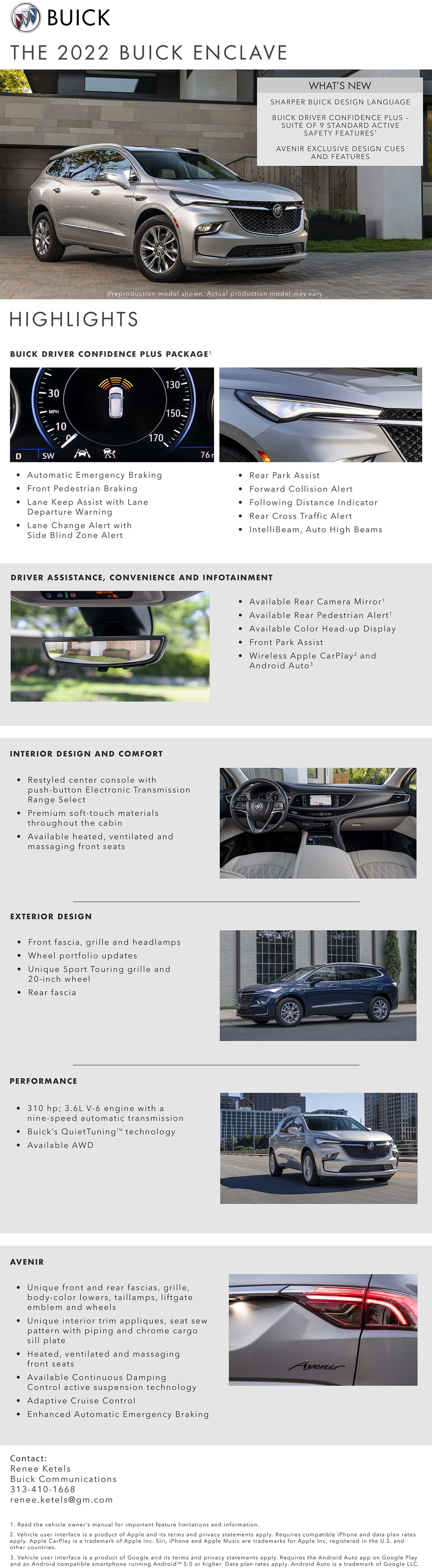 With a modern, expressive design and premium, intuitive technology, the Buick Enclave joins the redesigned Envision and new Encore GX in offering everything today’s SUV customers want: performance, design, driver-assistance technologies, connectivity, and passenger and cargo versatility.