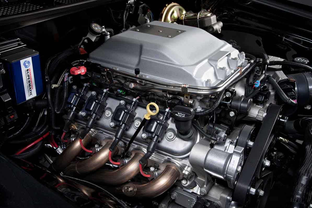 That racing heritage inspired the build of this show car, which features the new LT5 6.2L supercharged crate engine. It’s based on the engine that drives that Corvette ZR1 and is the most powerful production engine ever from Chevrolet, rated at 755 horsepower and 715 lb.-ft. of torque. It’s also a technology powerhouse, with Chevy’s first dual-fuel system, featuring direct injection and supplementary port injection, as well as a new, larger-displacement supercharger to boost the engine’s air charge.