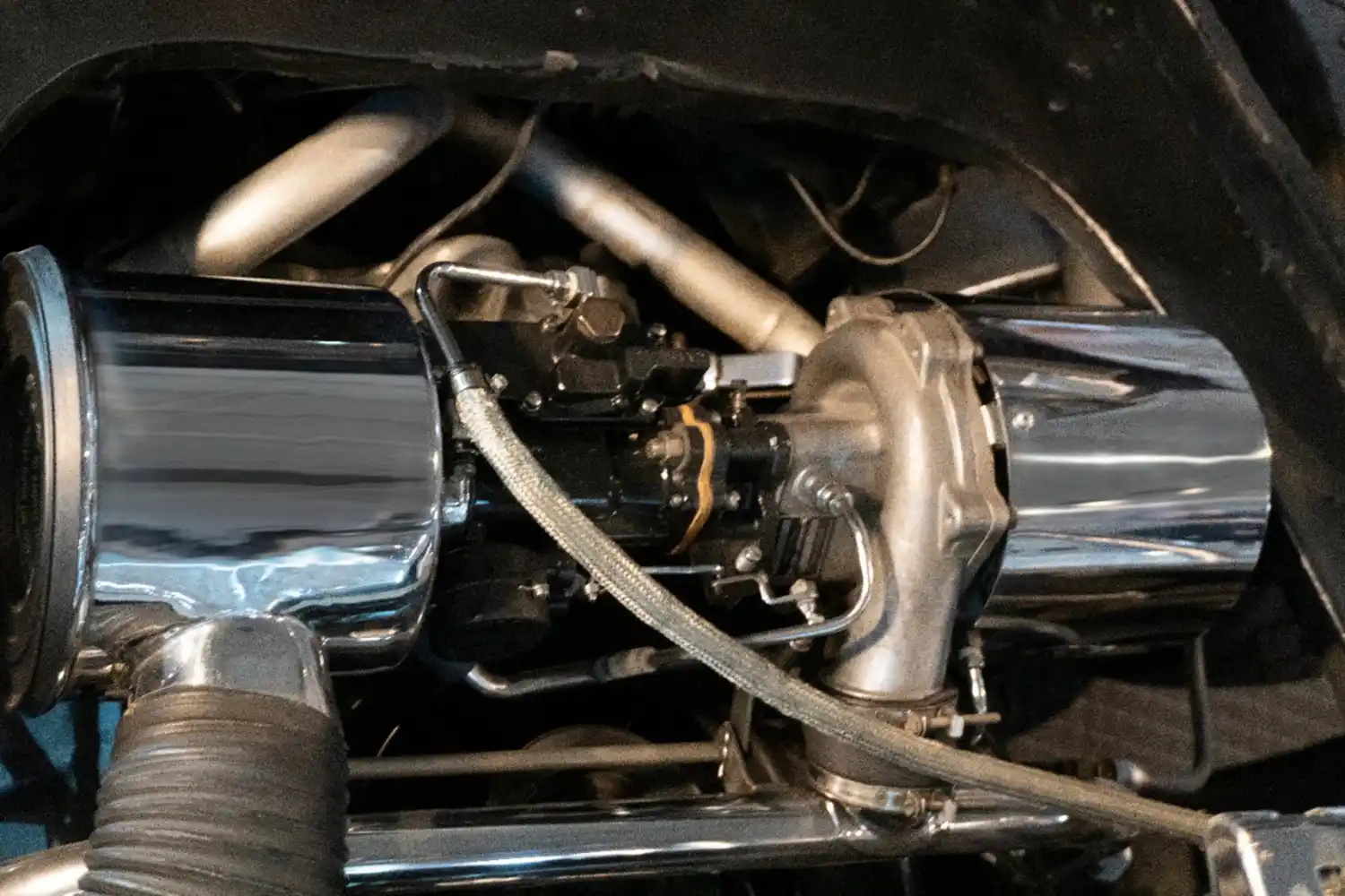 The Chevrolet Corvair Monza GT coupe toured together in early 1963 with the related Monza SS (Super Spyder, XP-797), styled as a roofless version of the GT, making a further public appearance at the New York International Auto Show. Although both cars were fundamentally based on existing Corvair drivetrain components and resembled each other externally, each represented a separate development of the Corvair design. In the Monza SS, the six-cylinder/six-carburetor engine was left in its stock location behind the transaxle, allowing a shorter 88 in-long (2,235 mm) wheelbase. Like the XP-777/Monza GT, the XP-797/Monza SS chassis was developed by Winchell’s team and the body was styled by Mitchell’s Studio X team (Shinoda and Lapine).