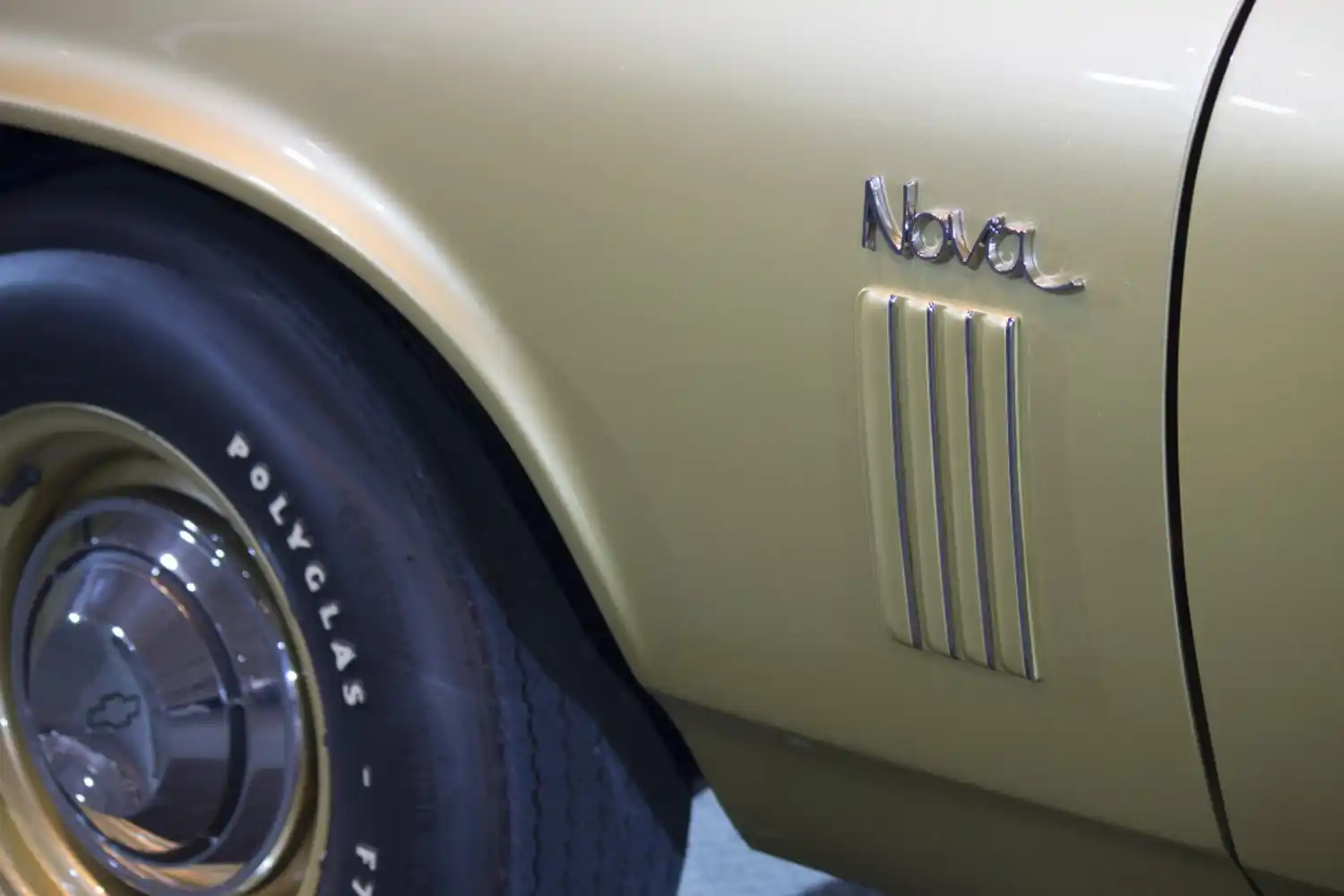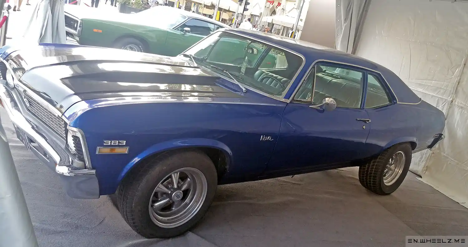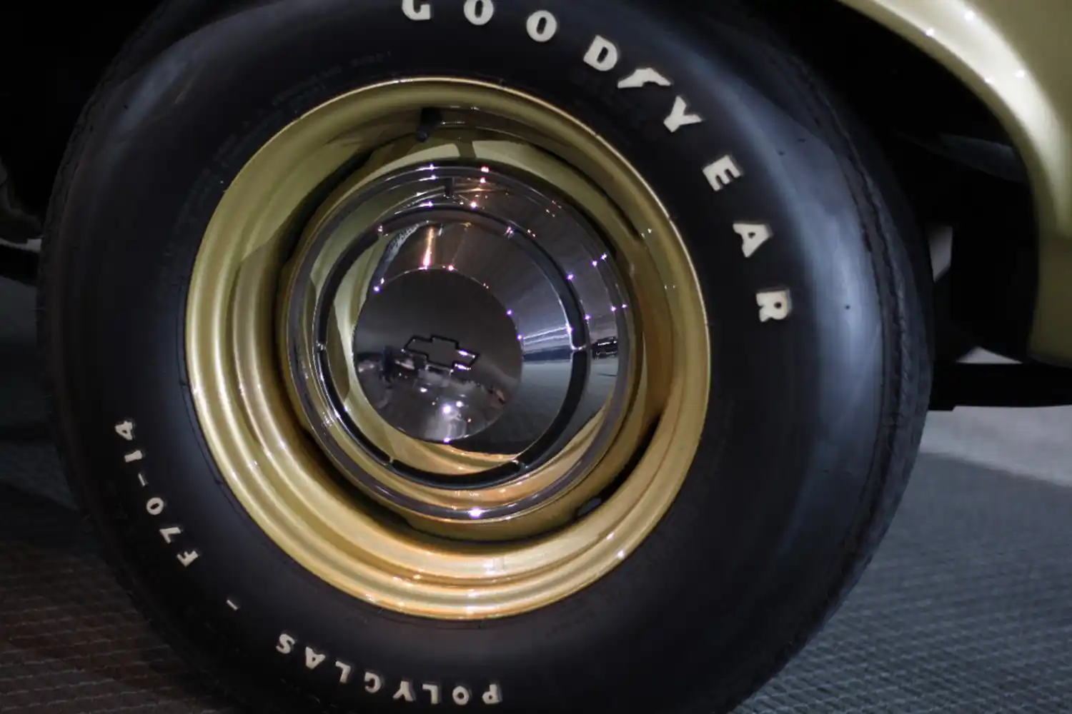 The 1970 Chevrolet Nova had mild styling changes from all-new models introduced in 1968. This car is a Nova SS and the package included 375 horsepower – 396 CID big block V8, dual exhausts, power front brakes, simulated hood air intake, simulated fender louvers, black out grille 14×7 inch wheels and E70 – 14 white-stripe tires.
