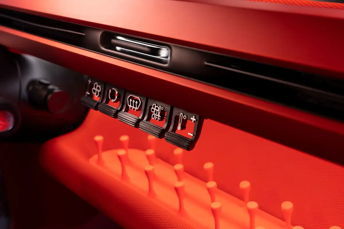 Instead of a full dashboard with multiple screens and hidden computers, oli features a single symmetrical ‘beam’ running across the width of the console and features the steering column, a smartphone dock, and five clearly identified toggle switches for the air conditioning system in the centre.