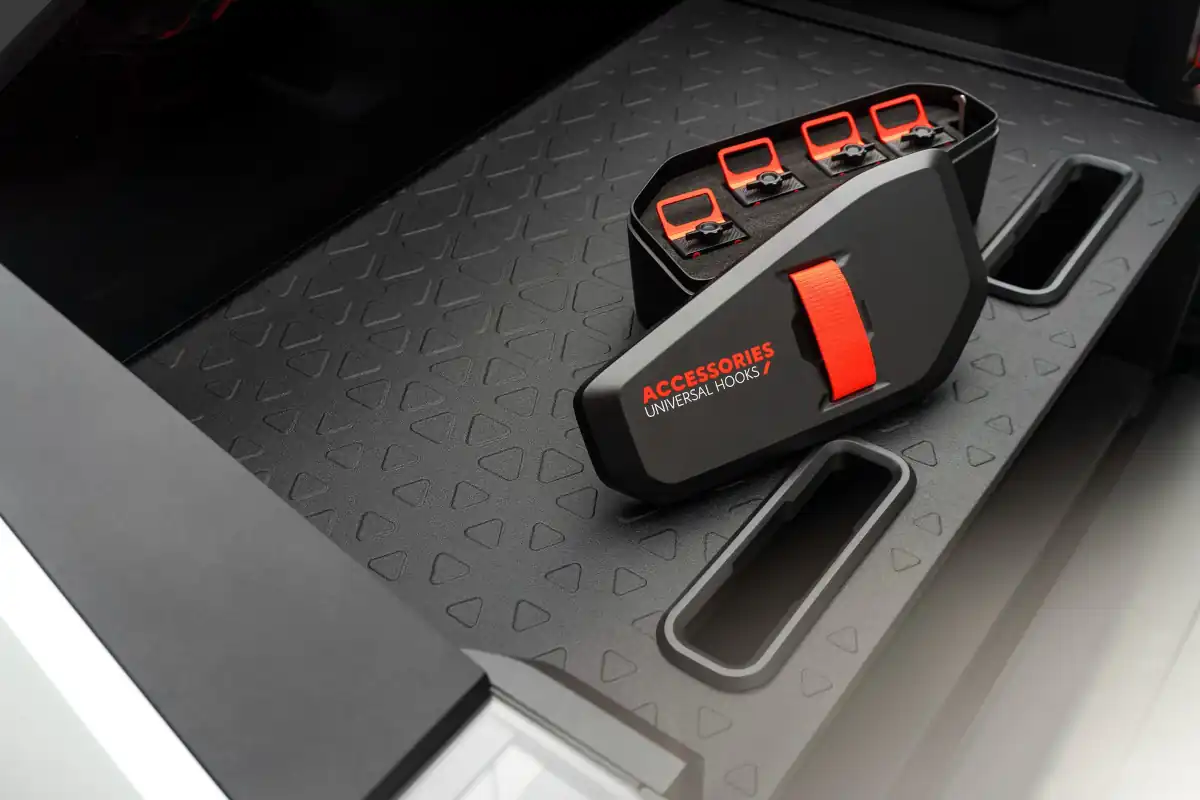 On each side of the vehicle below the rear seats, and accessible when rear doors are open, is a discreet storage compartment for a first aid kit. A storage console sits neatly in the space between the individual rear seats. Like the ‘sofa’, this orange, recyclable soft 3D-printed TPU component features flexible “mushrooms” to hold items in place. Notably, all interior BASF TPU parts can be recycled together, which is a further step towards sustainable mono-materiality as an element of the Life Cycle Assessment.