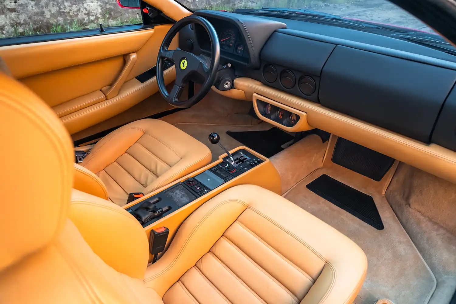 Luxurious Beige Connolly Leather Interior: The cockpit of this 512 TR is trimmed in supple Beige Connolly leather, adorning the seats, door panels, and lower dashboard, creating a luxurious and inviting atmosphere. Interior appointments include motorized seat belts, power windows, and a classic gated shifter located on the center console, a hallmark of Ferrari’s manual-equipped models. A modern Sony RSX-GS9 head unit has been installed for enhanced audio, and the car features air conditioning for comfort. The three-spoke leather-wrapped steering wheel frames Veglia instrumentation, including a 200-mph speedometer and a 7,200-rpm tachometer, along with auxiliary gauges, providing the driver with essential vehicle information.
