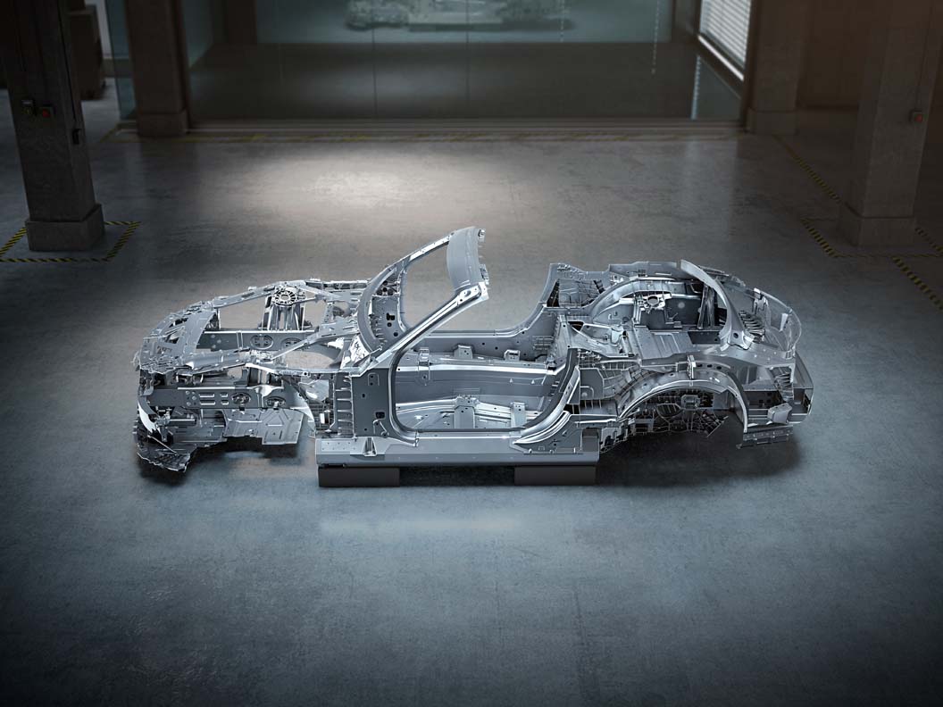 Compared to the previous model series, the torsional stiffness of the bodyshell structure increased by 18 percent. The transverse rigidity is 50 percent higher than that of the AMG GT Roadster, while the longitudinal rigidity is 40 percent higher. The likewise improved introduction rigidity for the chassis connection ensures sporty driving performance with precise handling and high agility. The weight of the pure bodyshell without doors, bonnet and boot lid, as well as without add-on assembly parts, is around 270 kilograms.