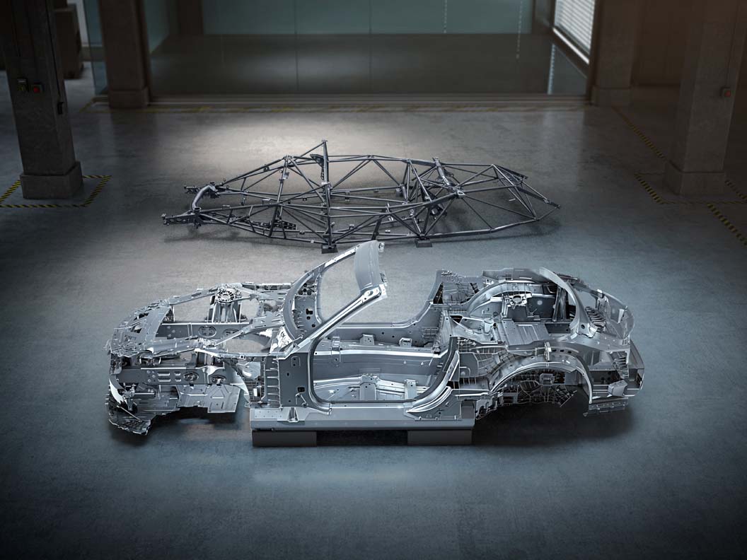 The new roadster architecture consists of the combination of an aluminium space frame with a self-supporting structure. It was created – as with the first SL in 1952 – literally on a blank sheet of paper: not a single component was taken over from the preceding SL model or, for example, from the AMG GT Roadster.